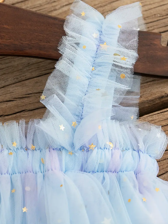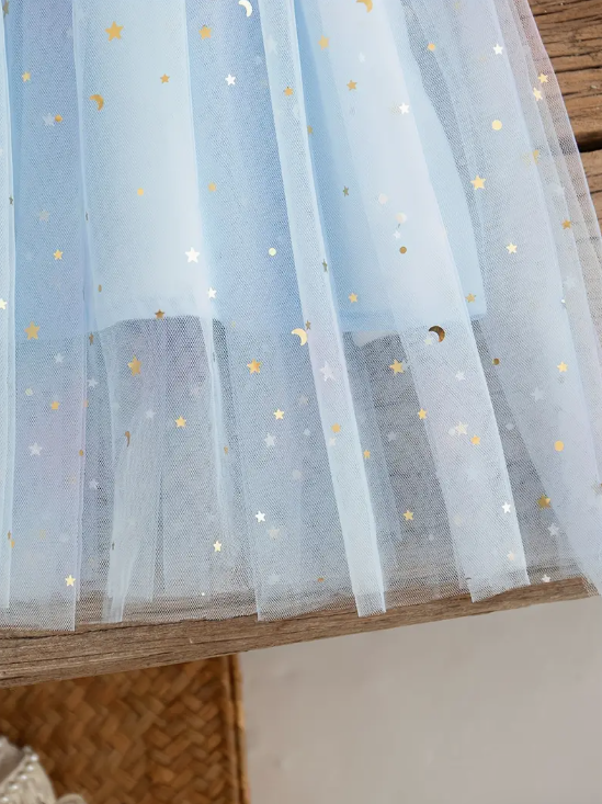 Light blue layered tulle with gold star and moon details