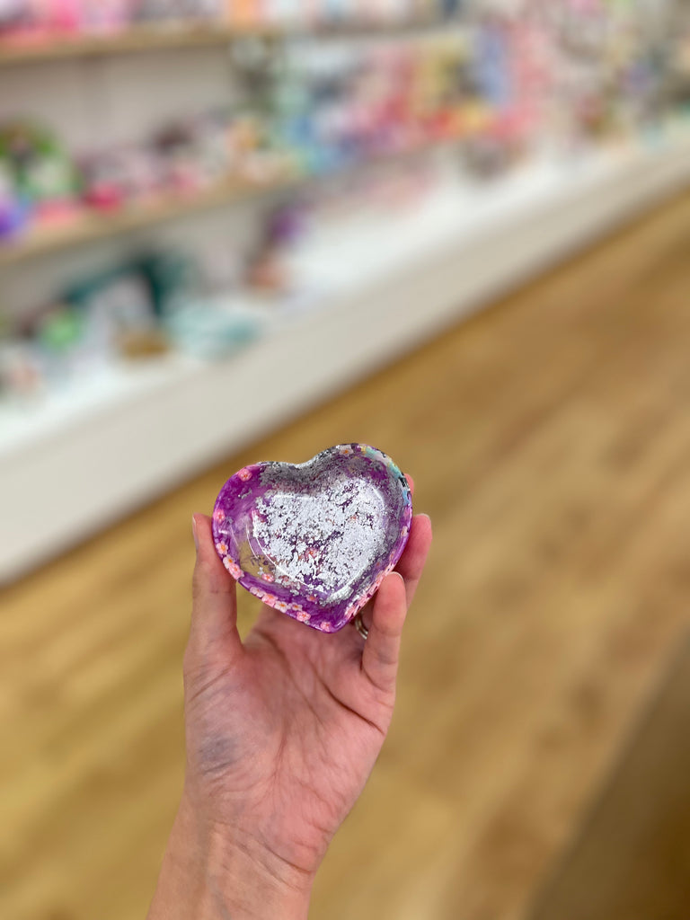 Resin art captures movement frozen in time. The swirl or ripple you see inside each heart is created within the first few minutes of pouring — meaning you’re looking at a moment that can never be repeated again.
