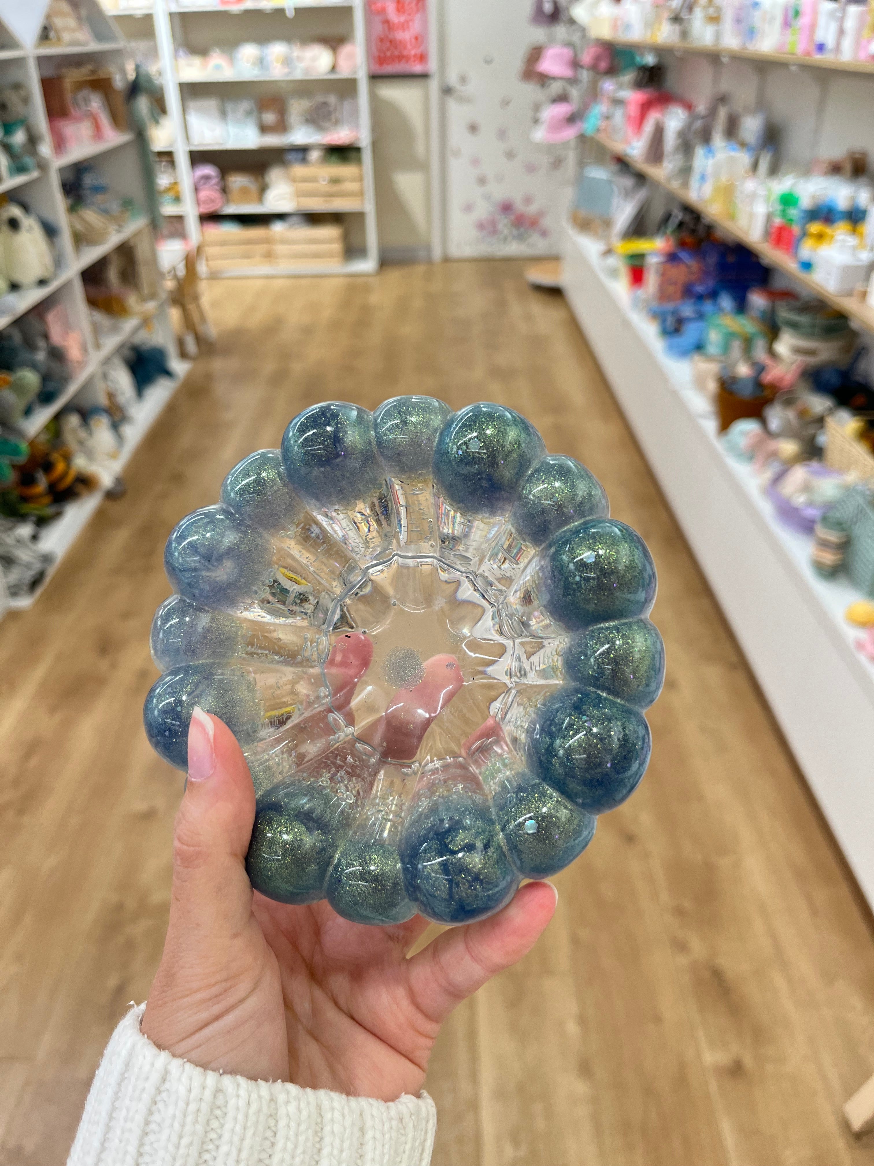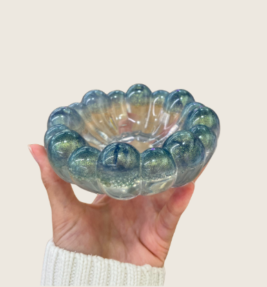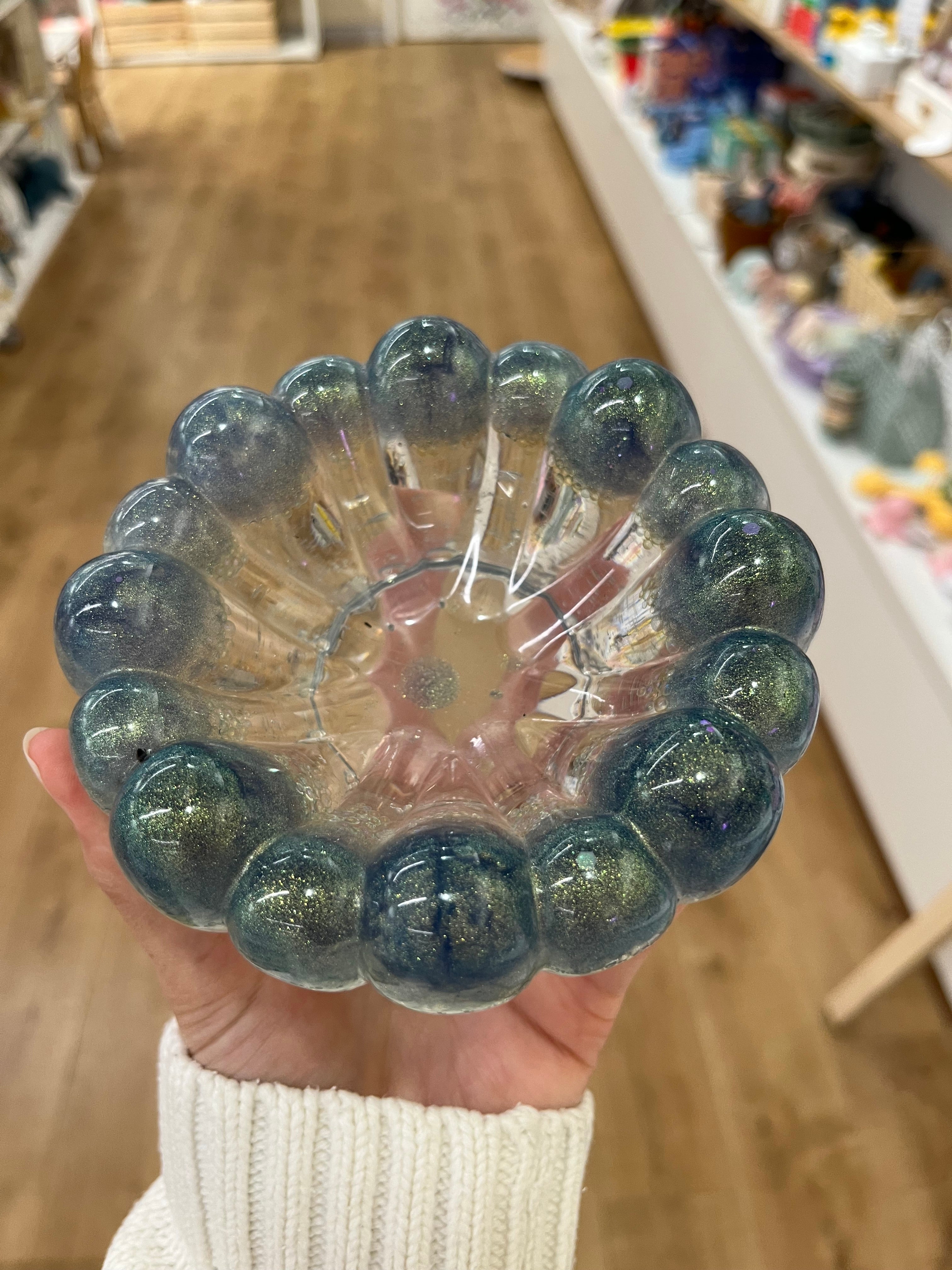 Bring a touch of celestial charm to your décor with this Iridescent Bubble Resin Bowl, featuring a unique ring of rounded bubble-like edges and a crystal-clear centre filled with shimmering depth. Its colours shift beautifully between soft blues, purples, and subtle earthy tones, giving it a dreamy, galaxy-inspired glow. Perfect as a trinket dish, display piece, or sensory play accessory, this bowl is both eye-catching and delightfully tactile. A striking little accent that adds magic to any room, shelf, or setup.
