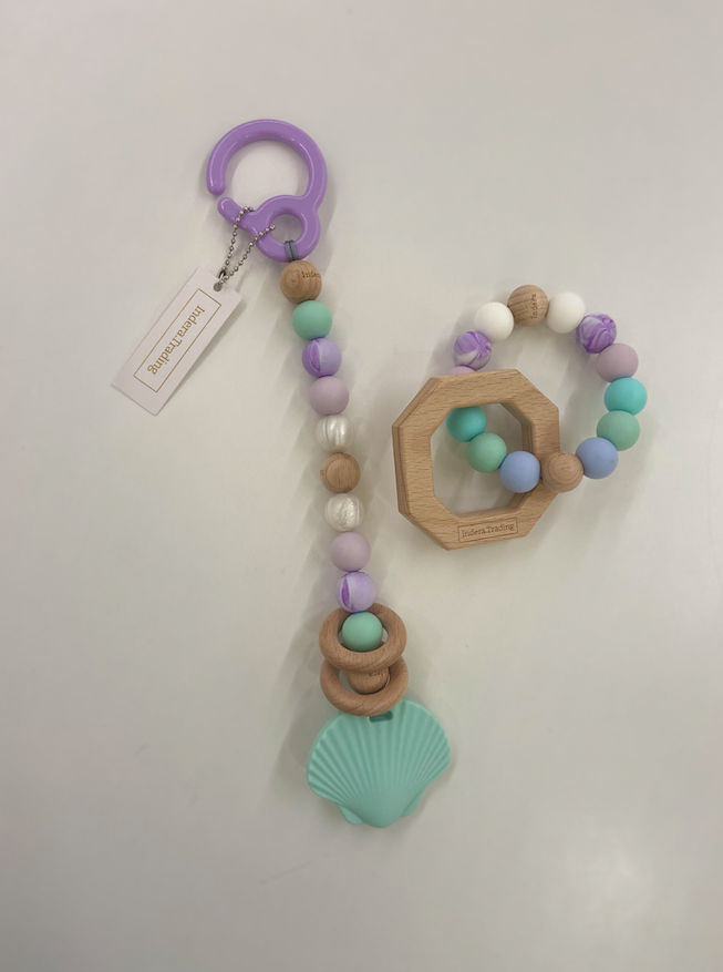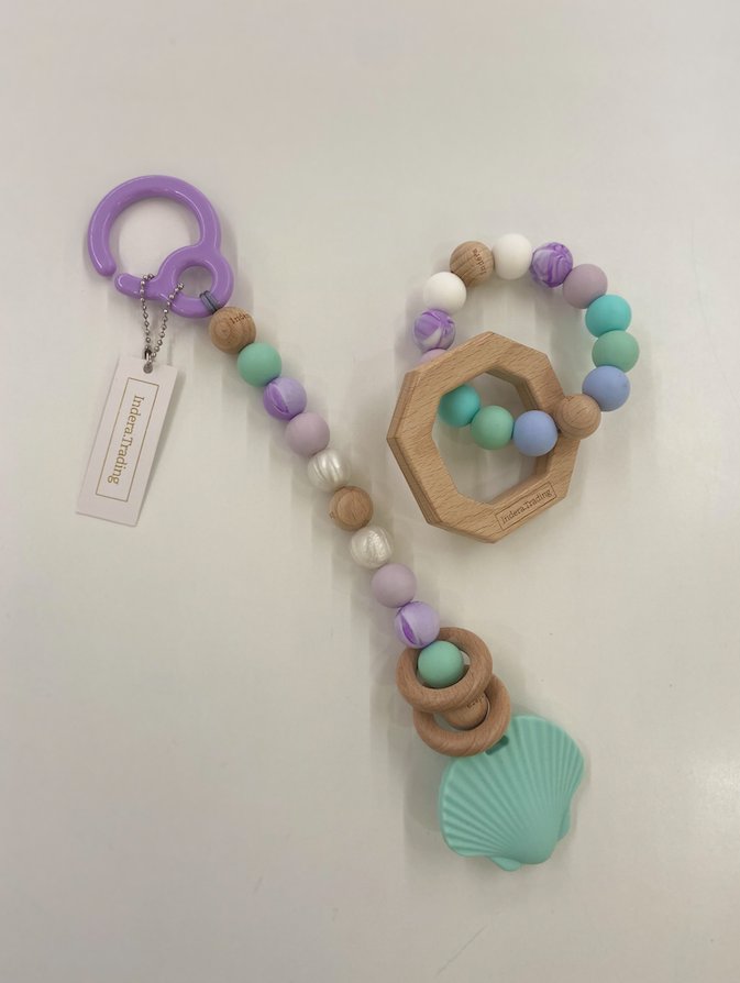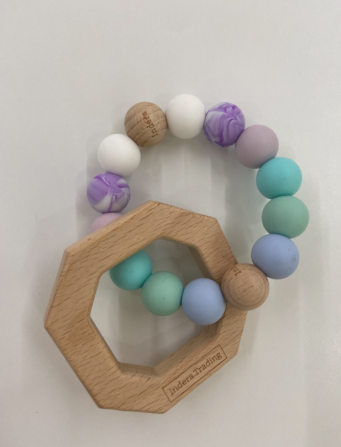 Dive into soothing comfort with our enchanting Mermaid Silicone Teether. Featuring dreamy tones of aqua, mint, baby blue, lilac, white, and purple marble, this teether is paired with beautiful wooden accent beads and a wooden octagon rattle for a gentle sensory touch. Handmade with love at Indera Trading, it’s the perfect mix of practical relief and magical style.