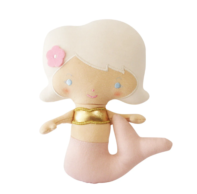 Beautiful Mini Mila Mermaid rattle features a sweet pink linen tail and rattles gently when shaken.