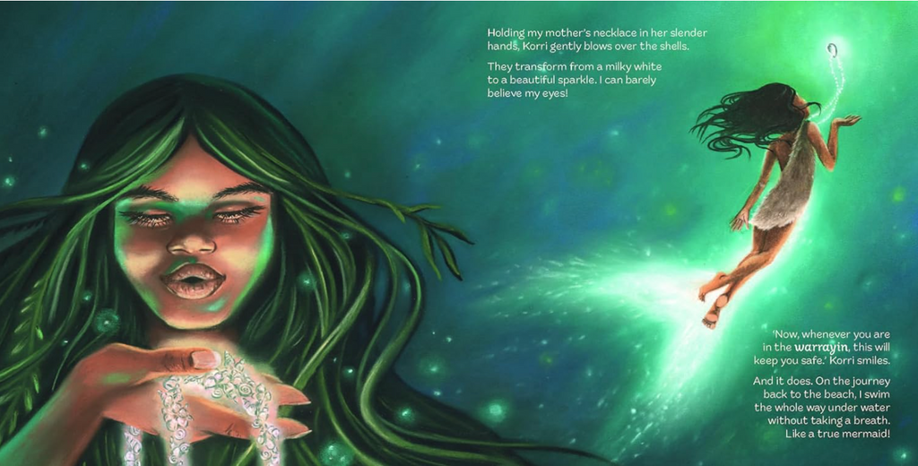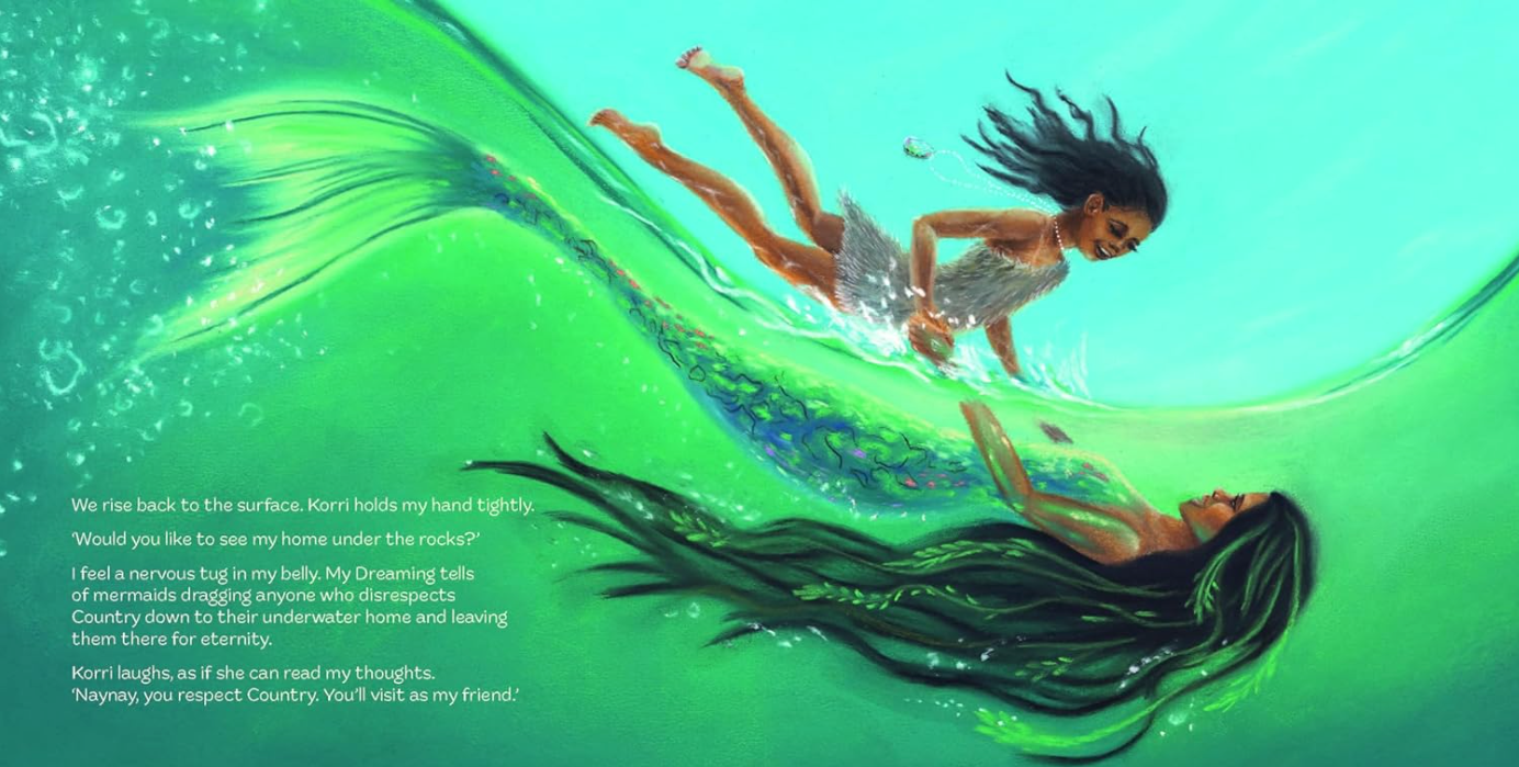 'With long tendrils of seagrass for hair, her body is blue green like the sea, and her tail sparkles with iridescent scales ...’ Naynay and her family are diving for abalone. Her mother tells her to keep watch for one of the water spirits who protect the seas. Naynay sees the splash of a tail. Could it possibly be ... a mermaid? Join Naynay on her magical underwater adventure, drawing on the stories of the Boonwurrung people of coastal Melbourne.