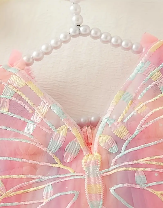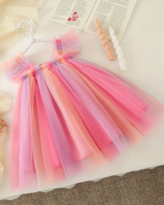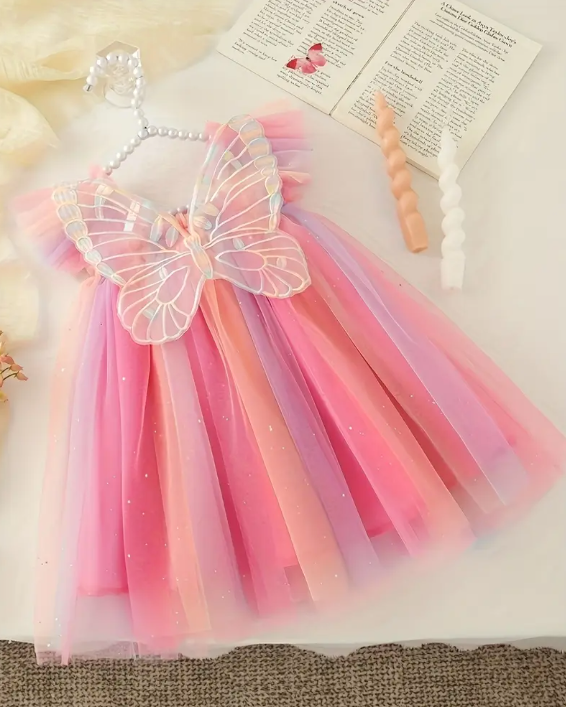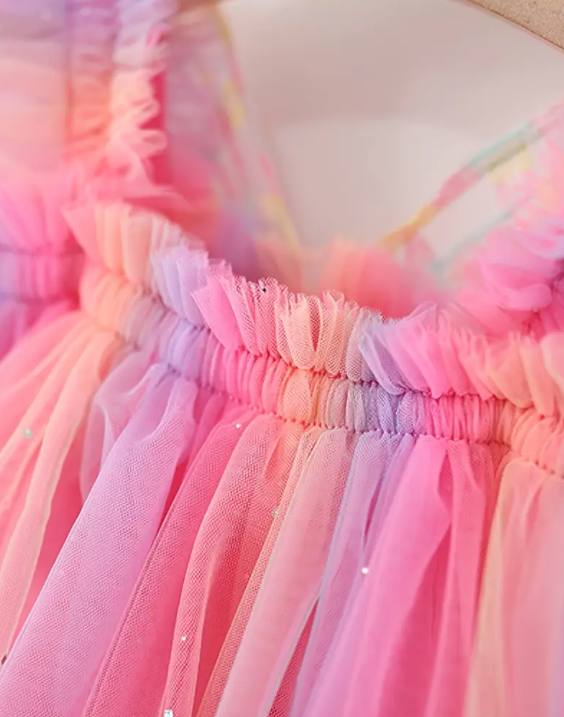 This dreamy Pink Rainbow Dress is made for magical moments! Layers of soft, pastel tulle in pink, peach, lilac, and coral create a beautiful rainbow effect, with a soft lining for all-day comfort. The fairy wings on the back add the perfect touch of whimsy—making every twirl feel like pure magic.