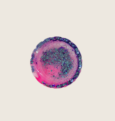Handmade by Indera Trading, this Bright Pink & White Resin Dish with Purple Glitter delivers a bold touch of magic. Vivid pink swirls mix with crisp white and shimmering violet sparkles, creating a striking, eye-catching piece. Measuring approximately 3.2 inches across, it’s perfect for potion play, sensory activities, trinkets, or as a decorative accent on a vanity or shelf. Playful, vibrant, and full of shimmer — a little dish of wonder.