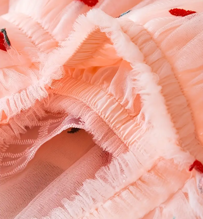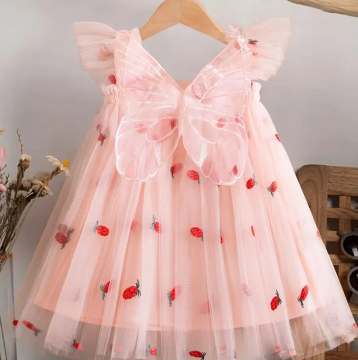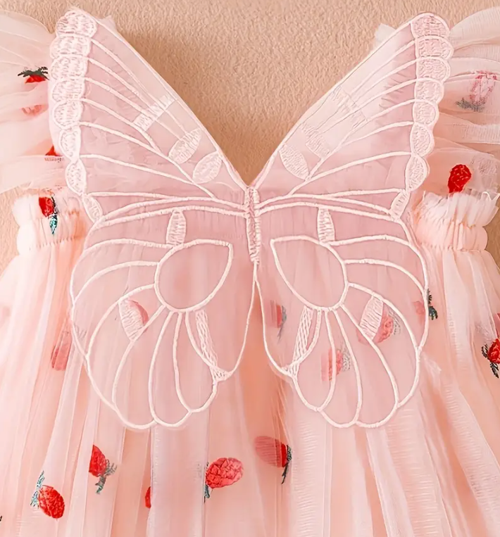 Float through magical days in this enchanting peach-coloured tulle dress, adorned with delicately embroidered strawberries and finished with a soft lining for all-day comfort. Beautiful embroidered tulle fairy wings on the back, add the perfect touch of whimsical charm. Ideal for little ones who adore magic, make-believe, and fairy-tale adventures.