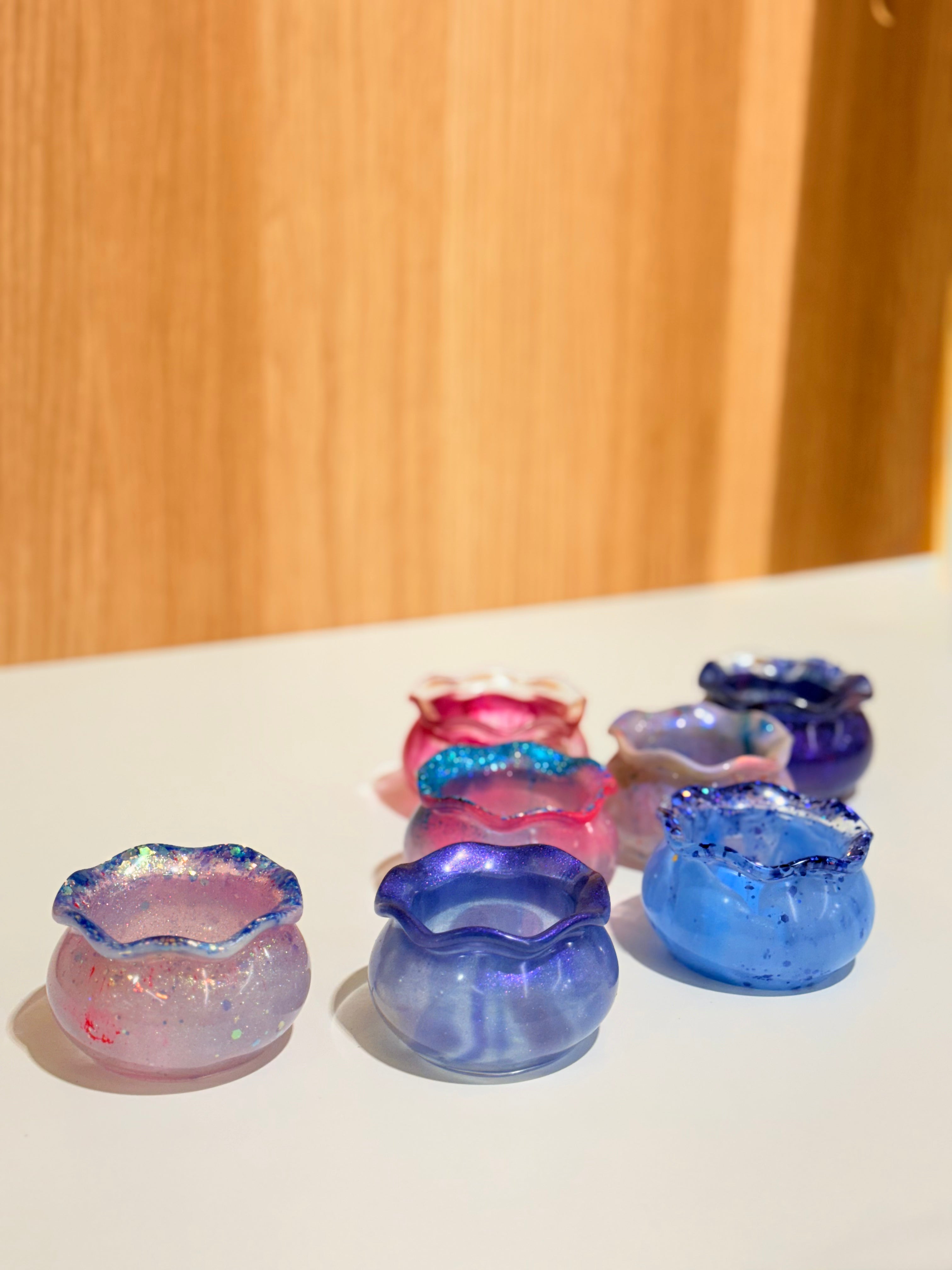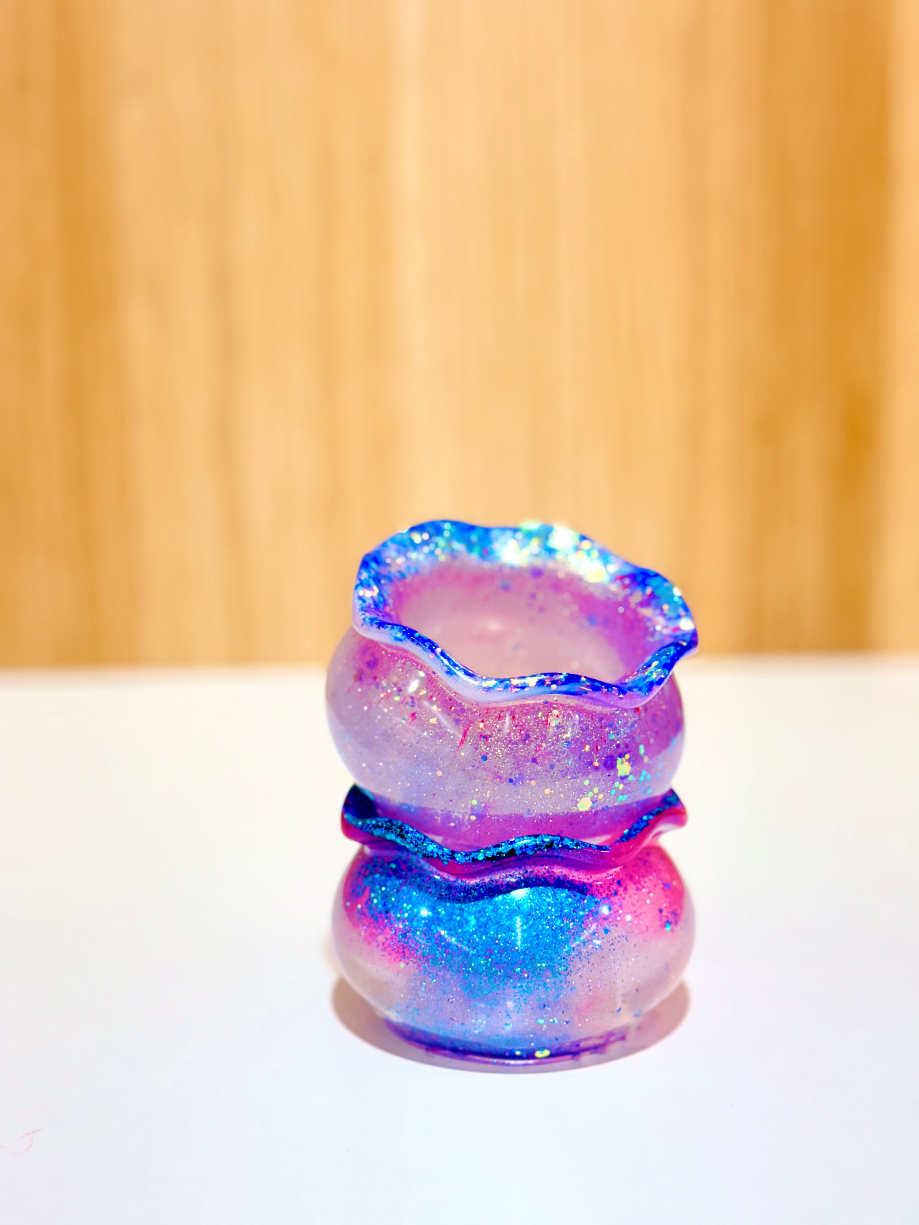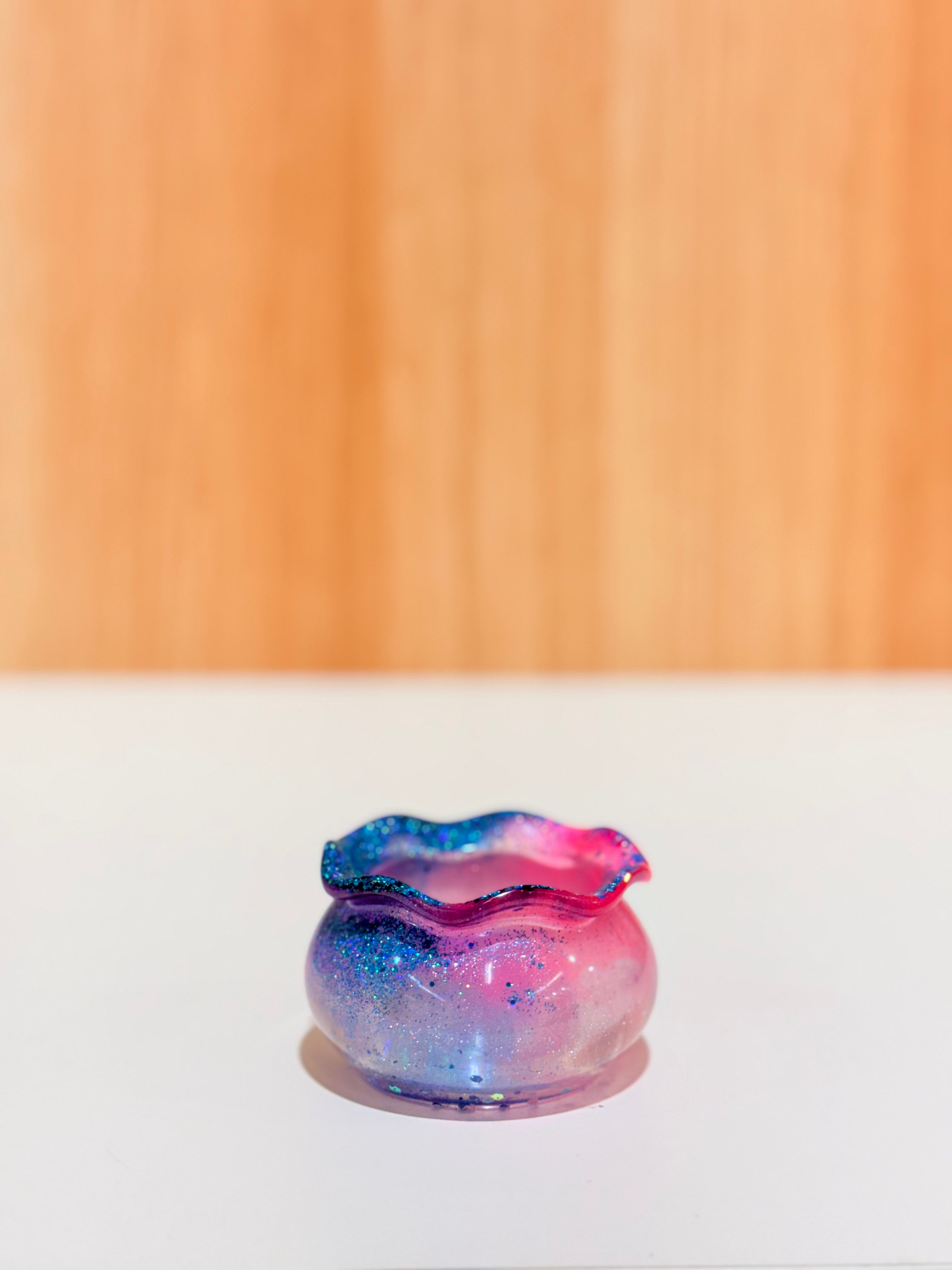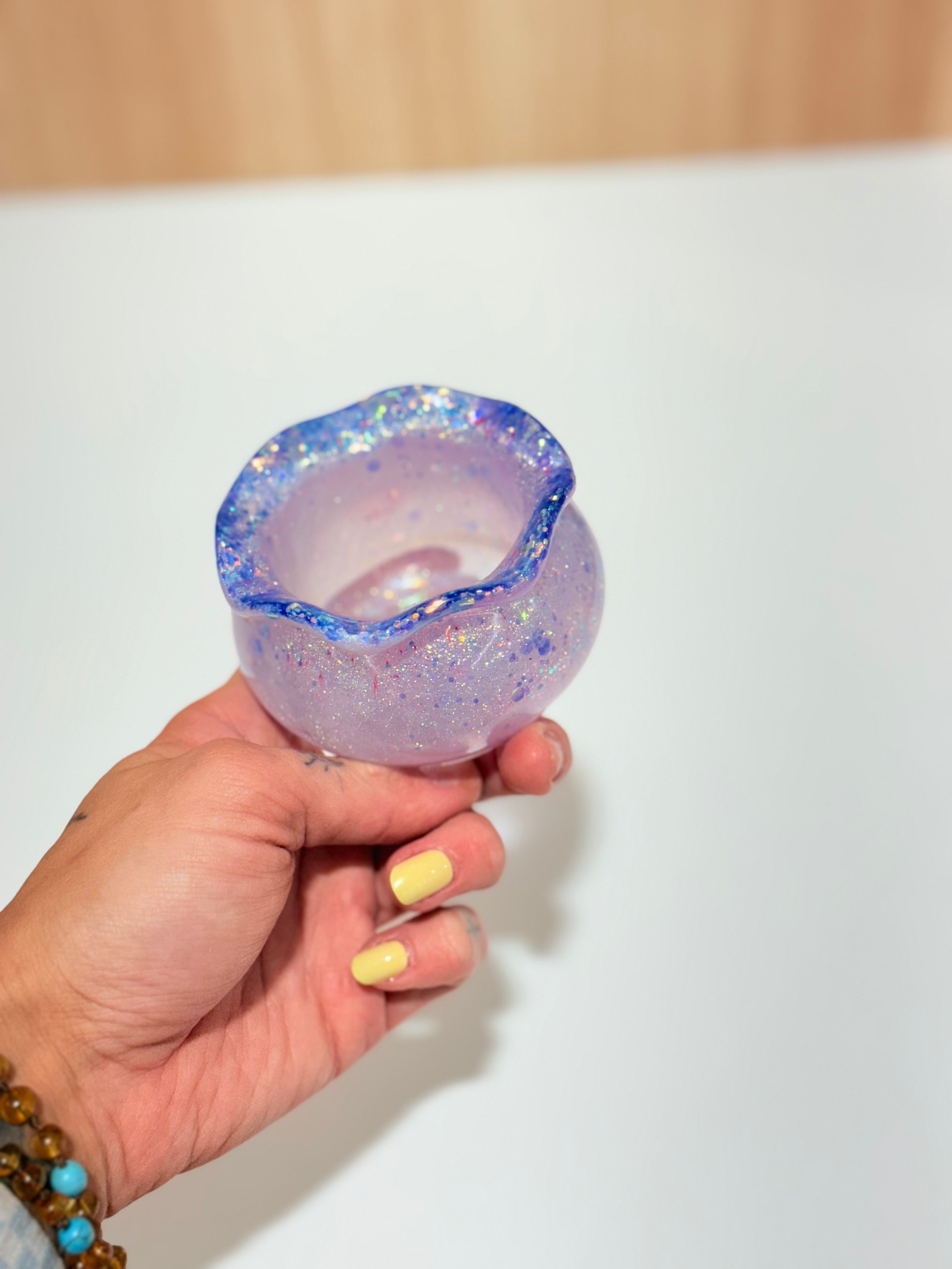 Hand-poured and one-of-a-kind, these resin pots feature soft, rounded “sack” shapes with gently ruffled rims and dreamy blends of purples, pinks, blues, and shimmering glitter. No two are ever the same—each one feels like a little treasure waiting to be discovered.