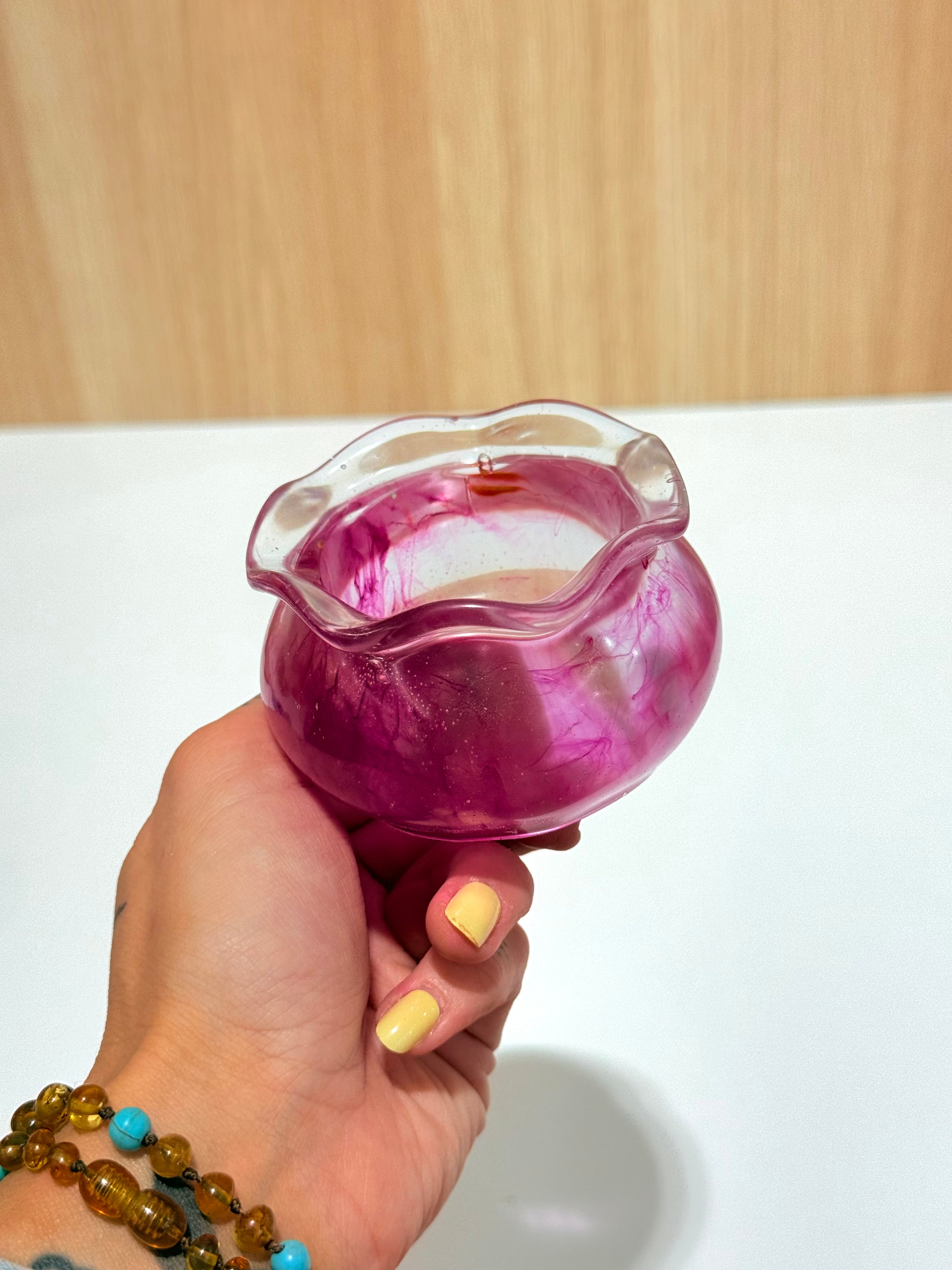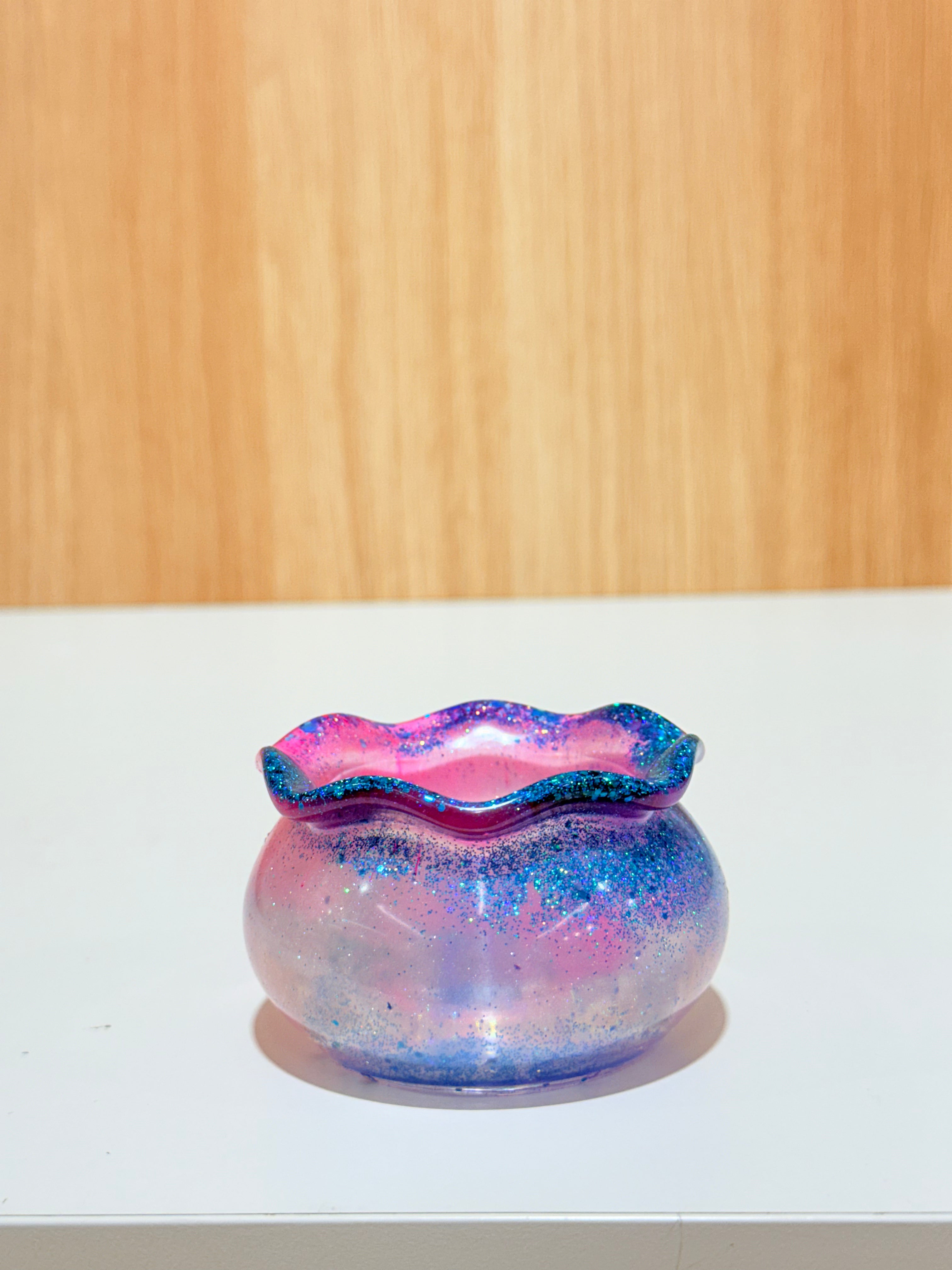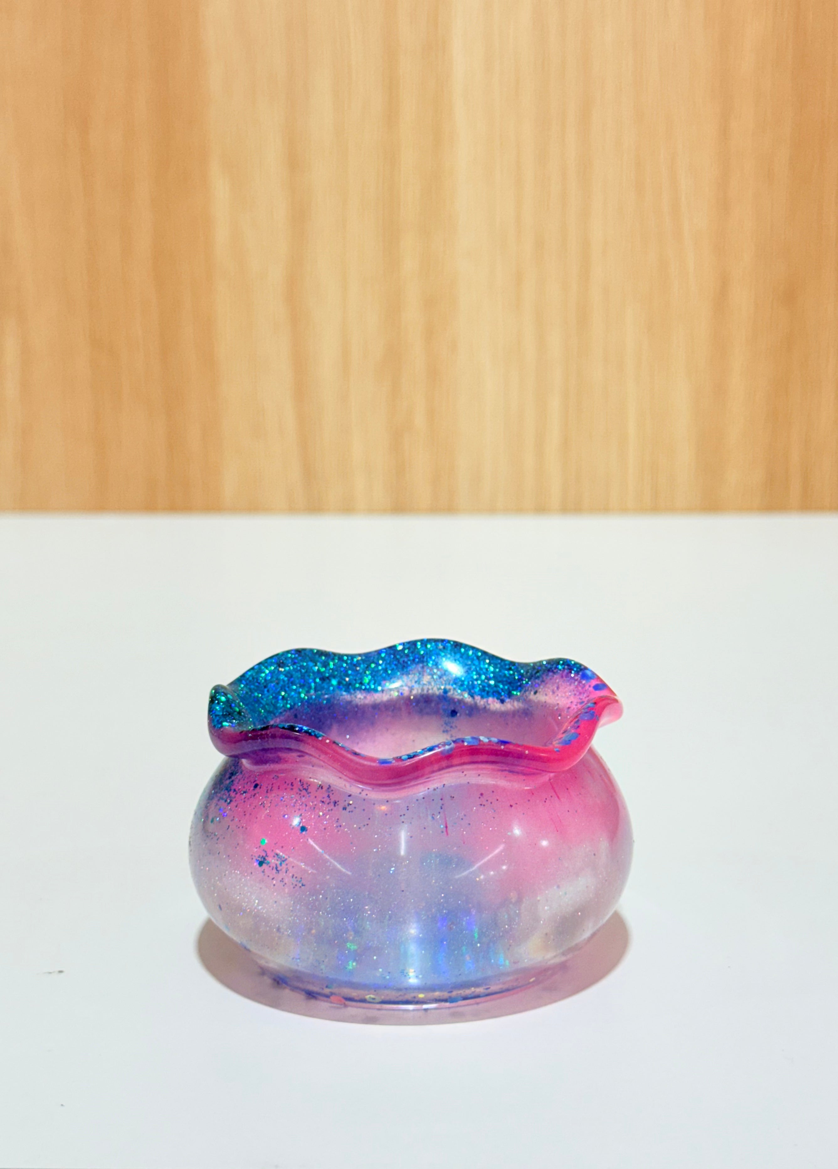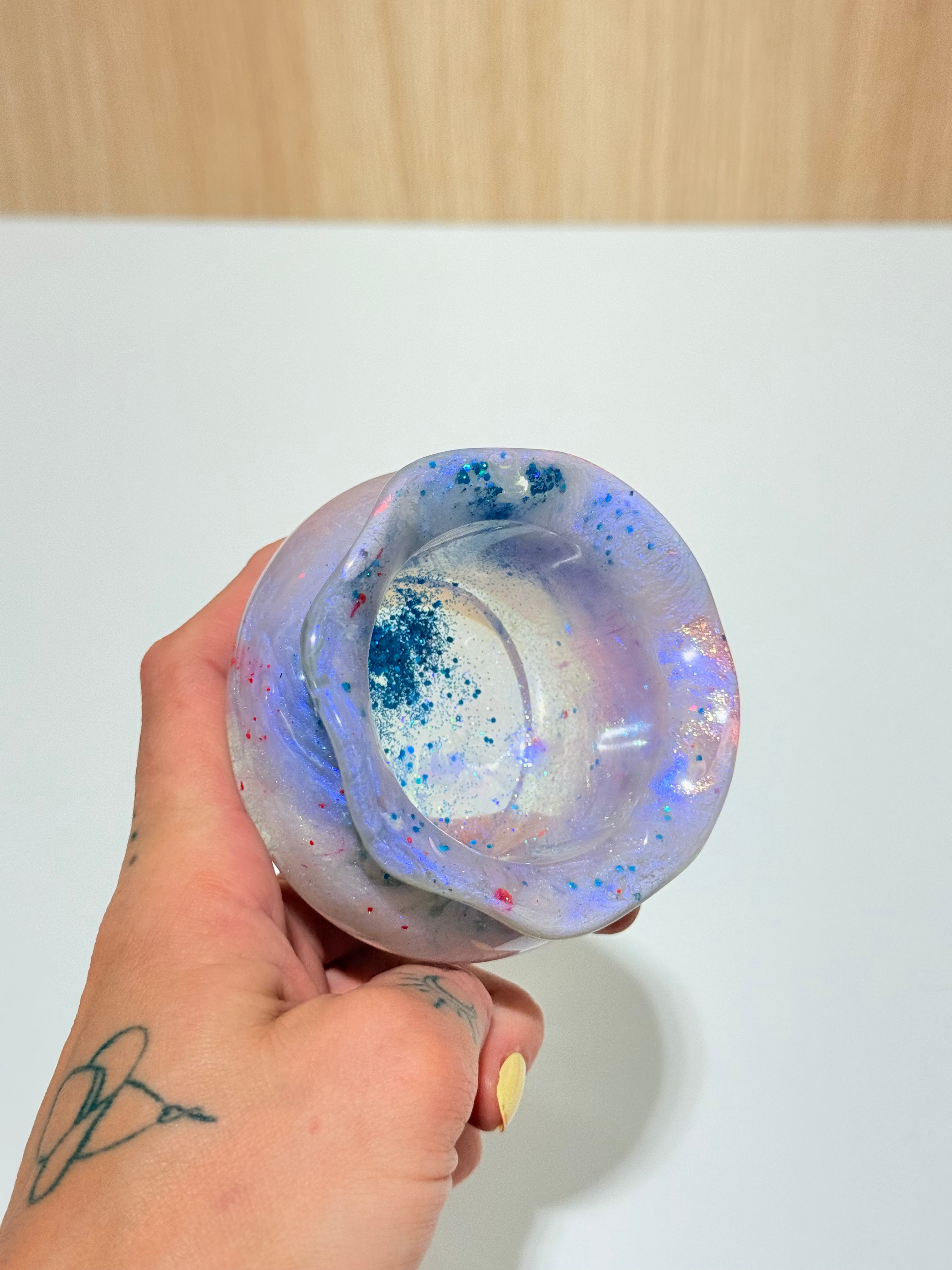 Hand-poured and one-of-a-kind, these resin pots feature soft, rounded “sack” shapes with gently ruffled rims and dreamy blends of purples, pinks, blues, and shimmering glitter. No two are ever the same—each one feels like a little treasure waiting to be discovered.