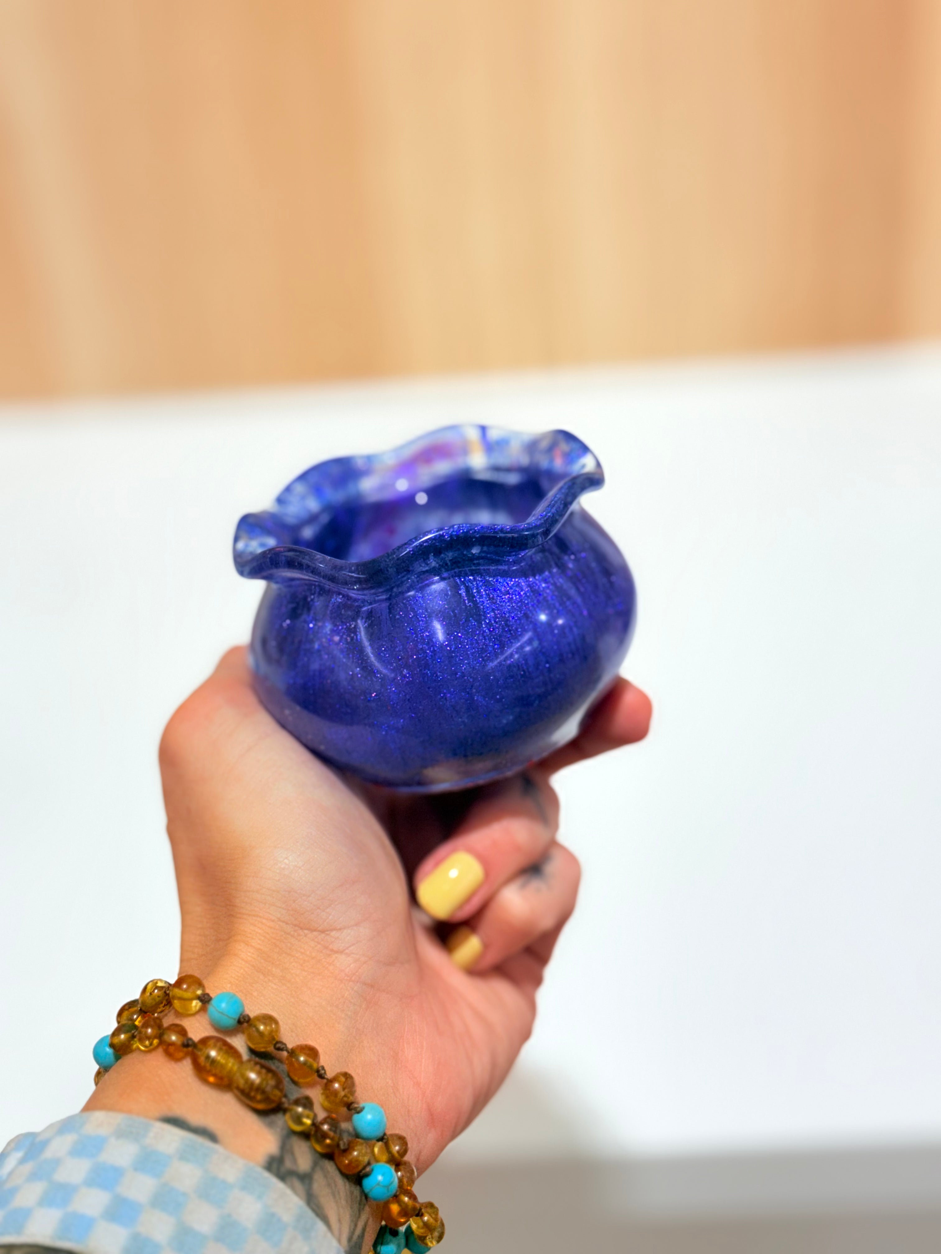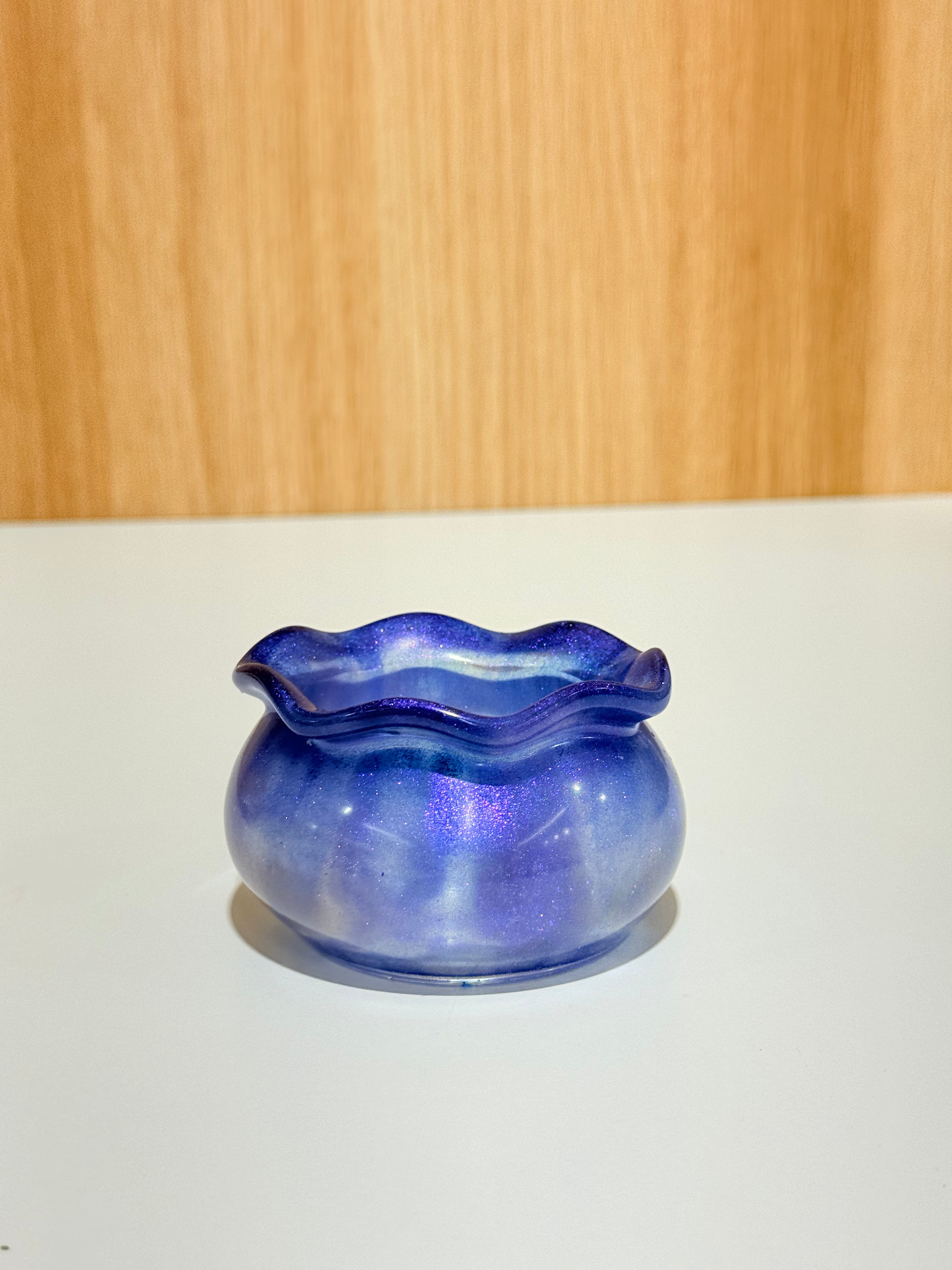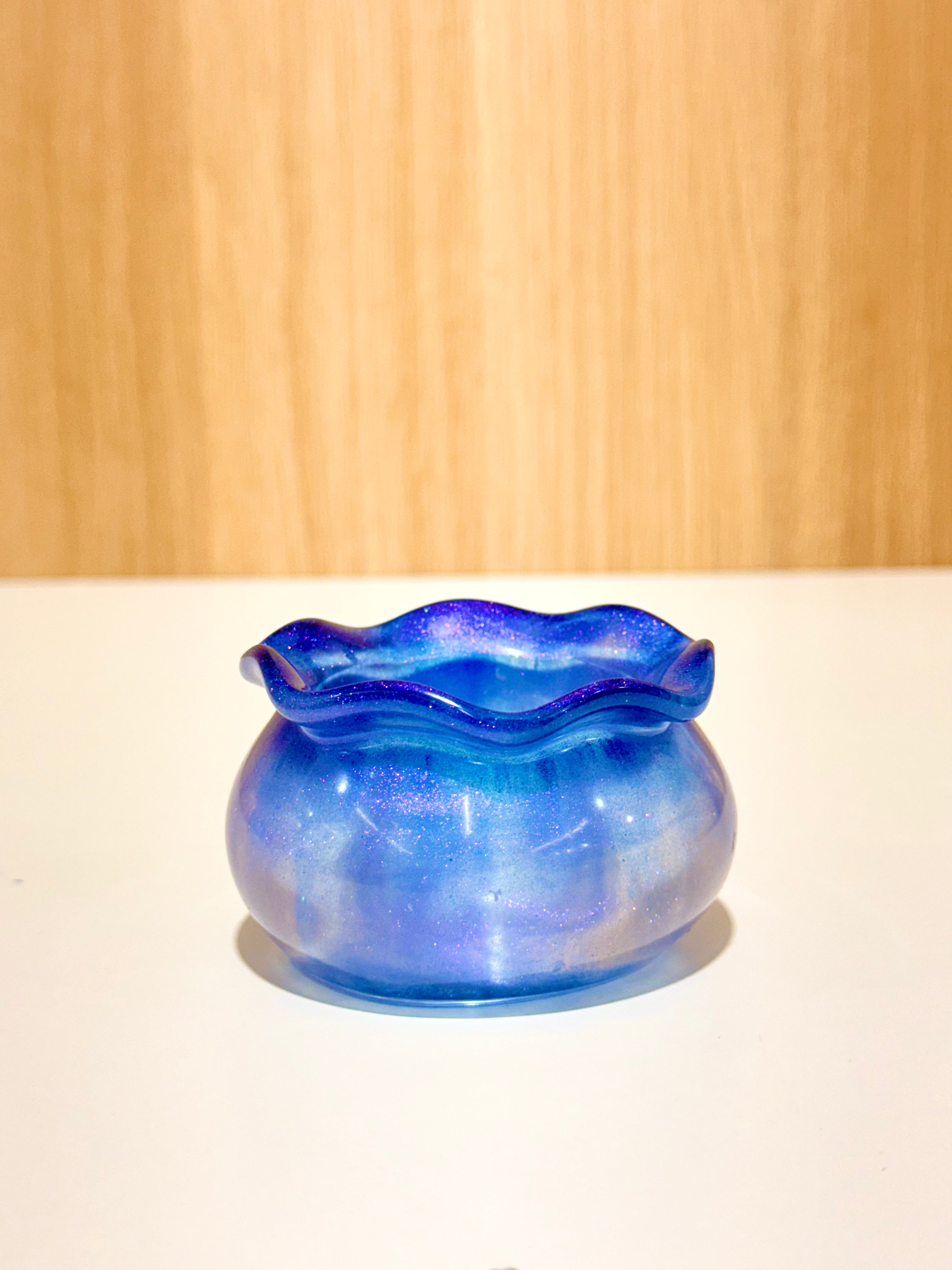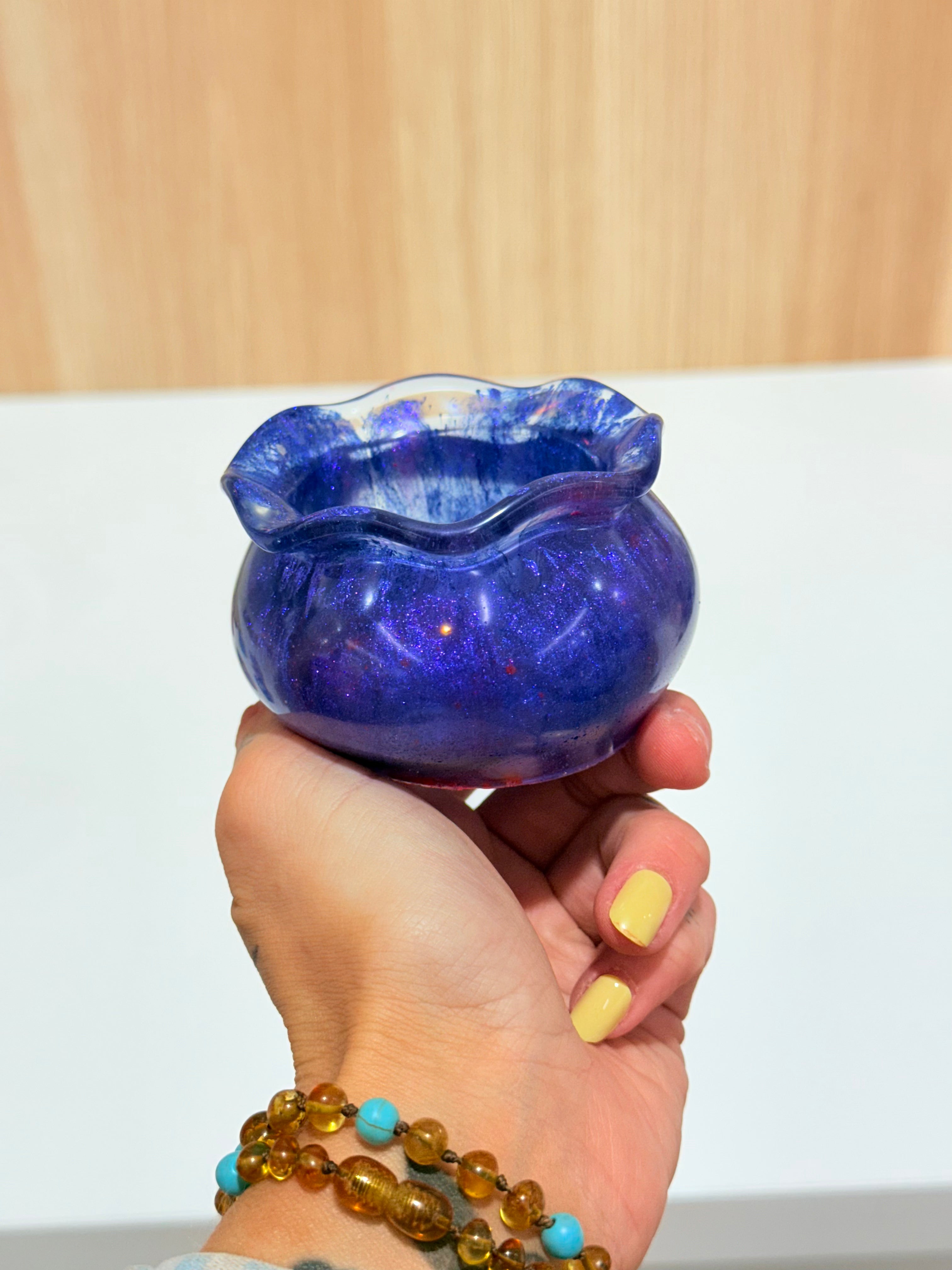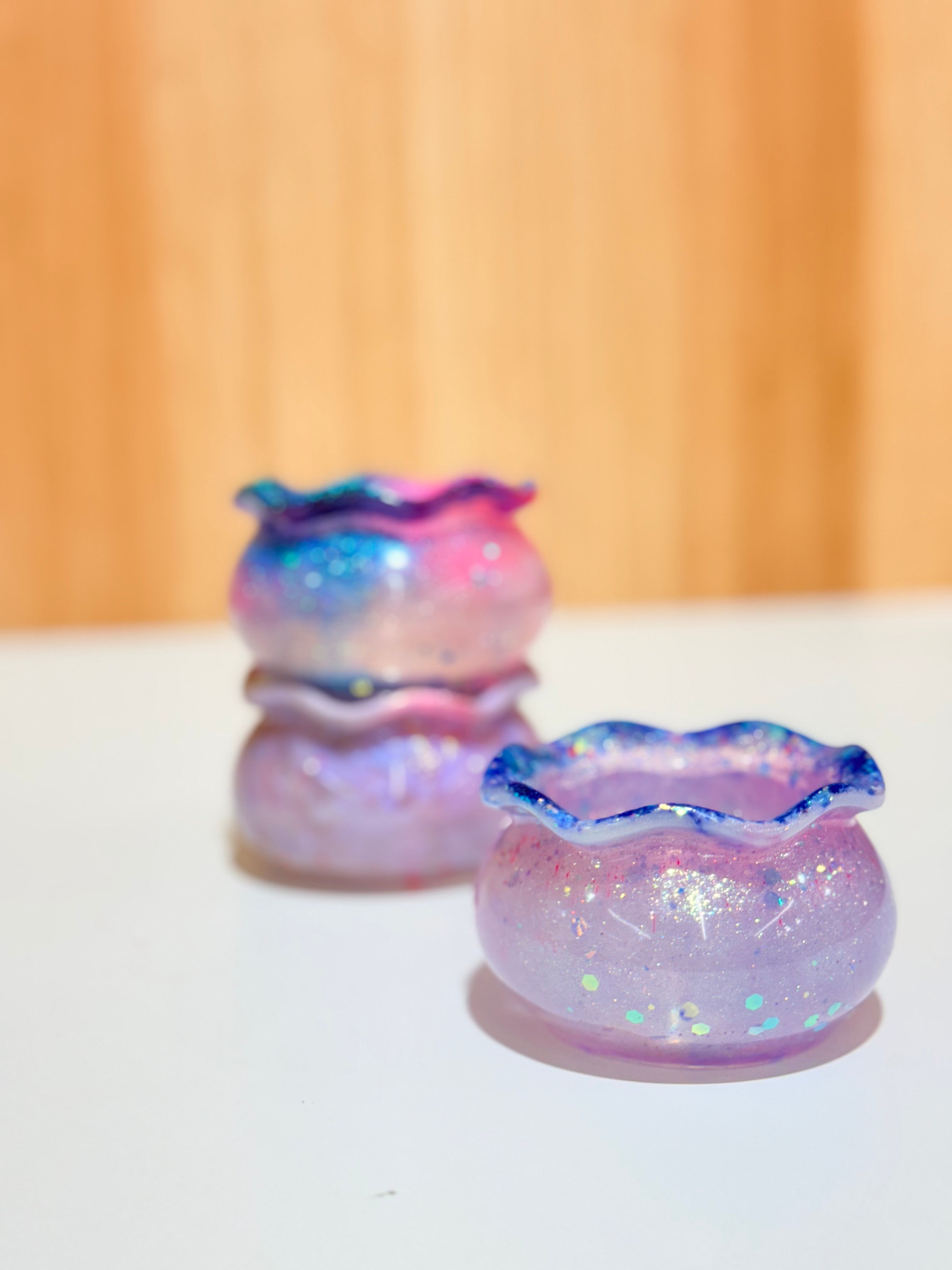 Hand-poured and one-of-a-kind, these resin pots feature soft, rounded “sack” shapes with gently ruffled rims and dreamy blends of purples, pinks, blues, and shimmering glitter. No two are ever the same—each one feels like a little treasure waiting to be discovered.