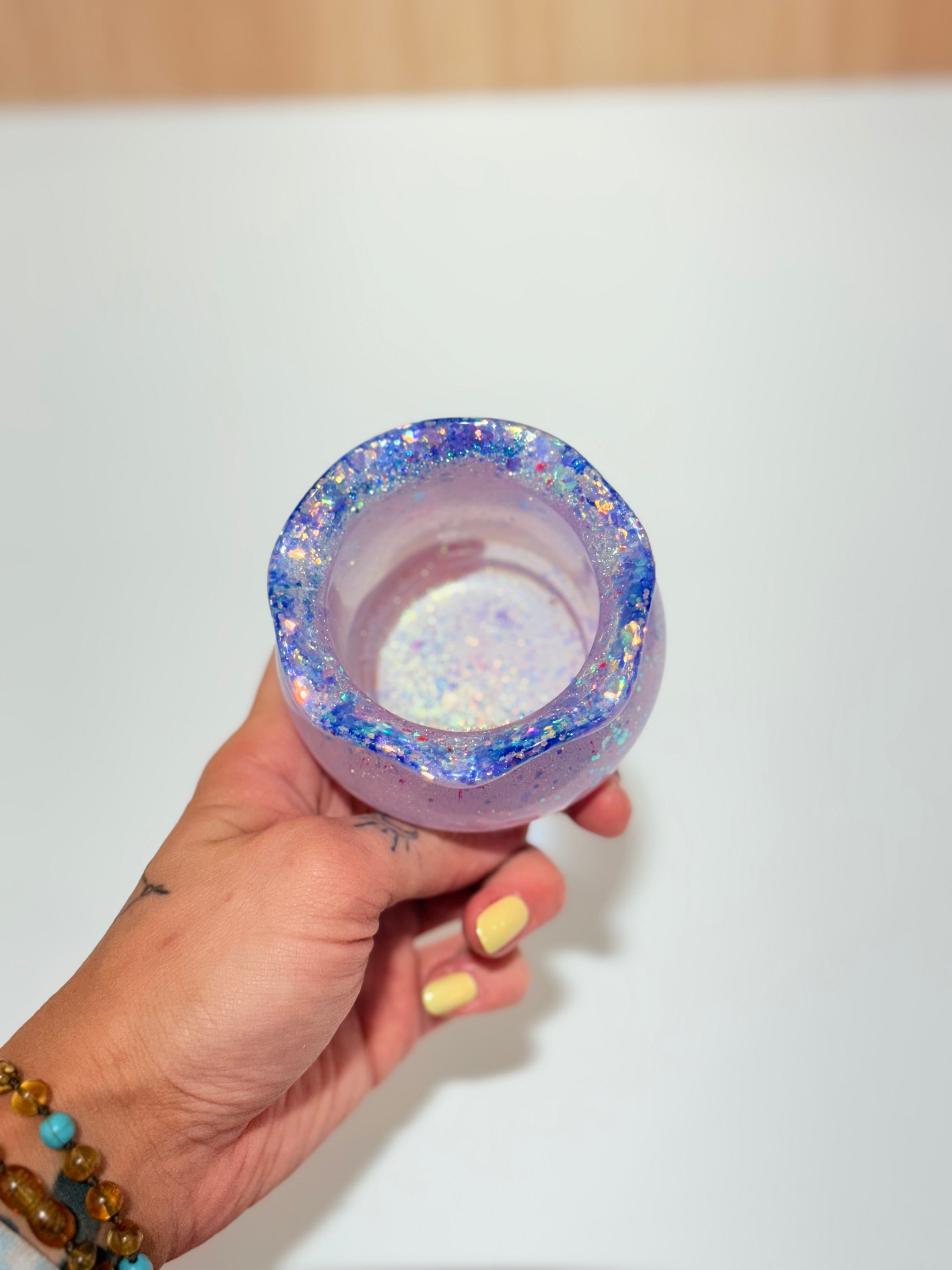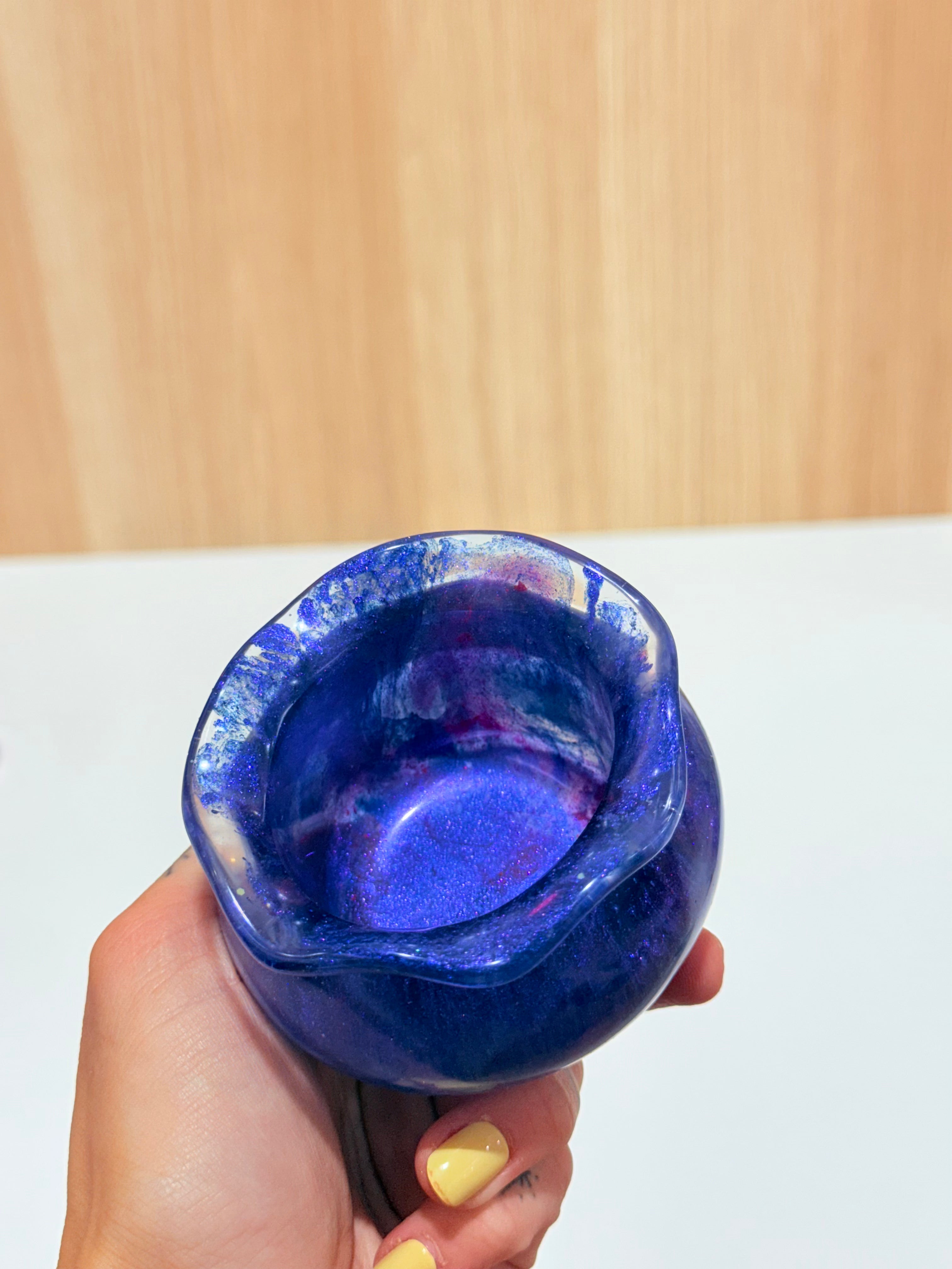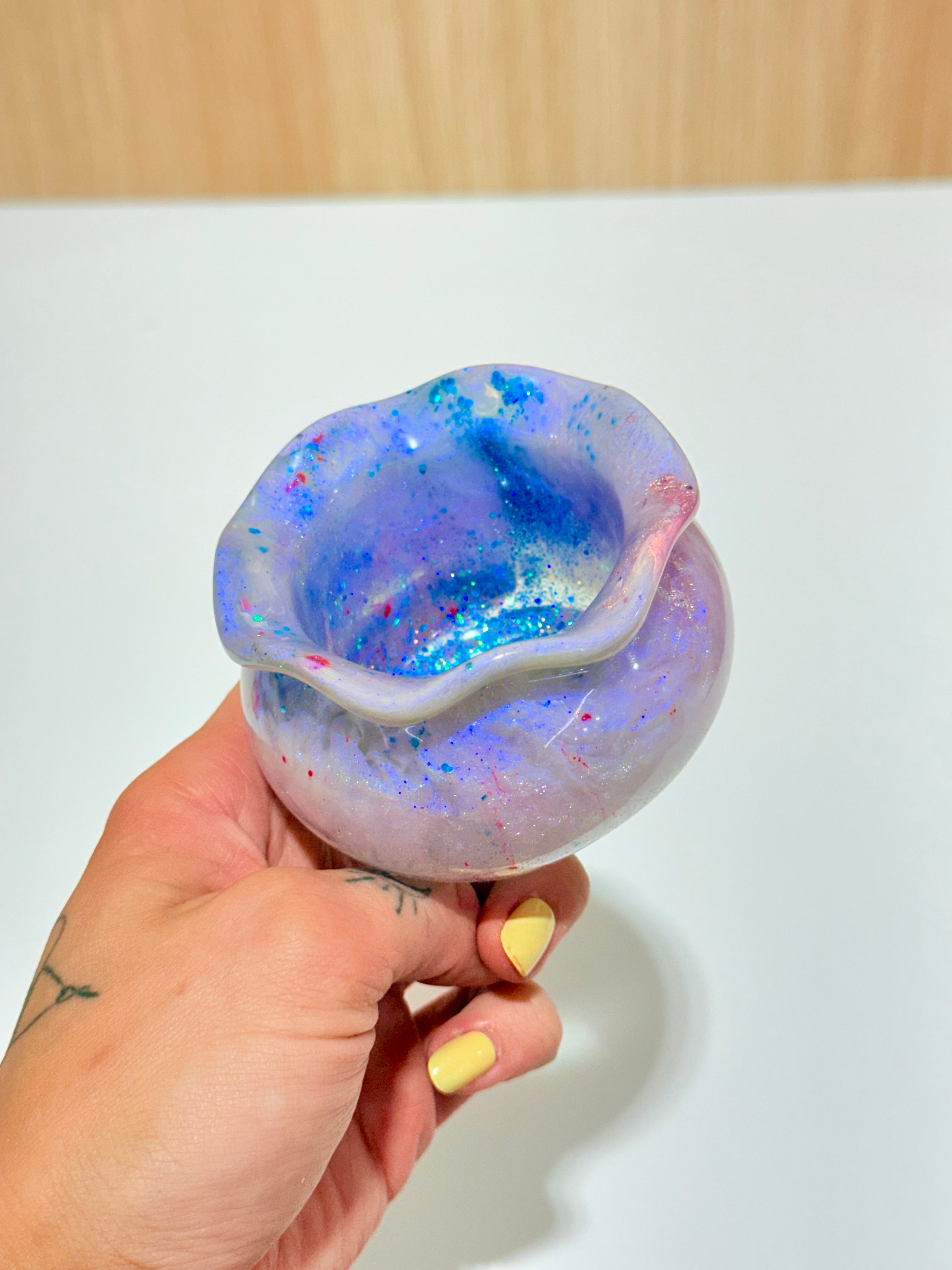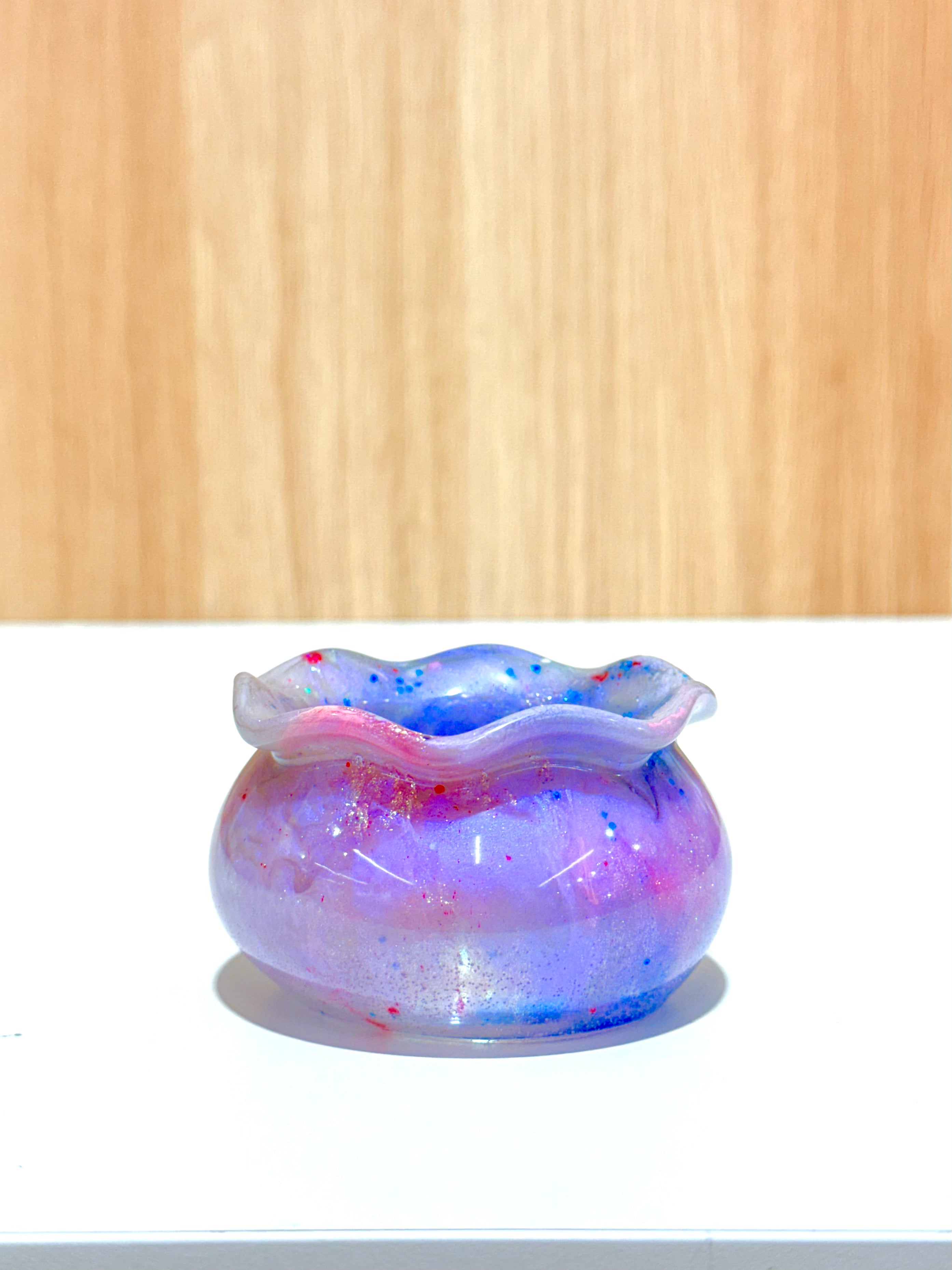 Hand-poured and one-of-a-kind, these resin pots feature soft, rounded “sack” shapes with gently ruffled rims and dreamy blends of purples, pinks, blues, and shimmering glitter. No two are ever the same—each one feels like a little treasure waiting to be discovered.