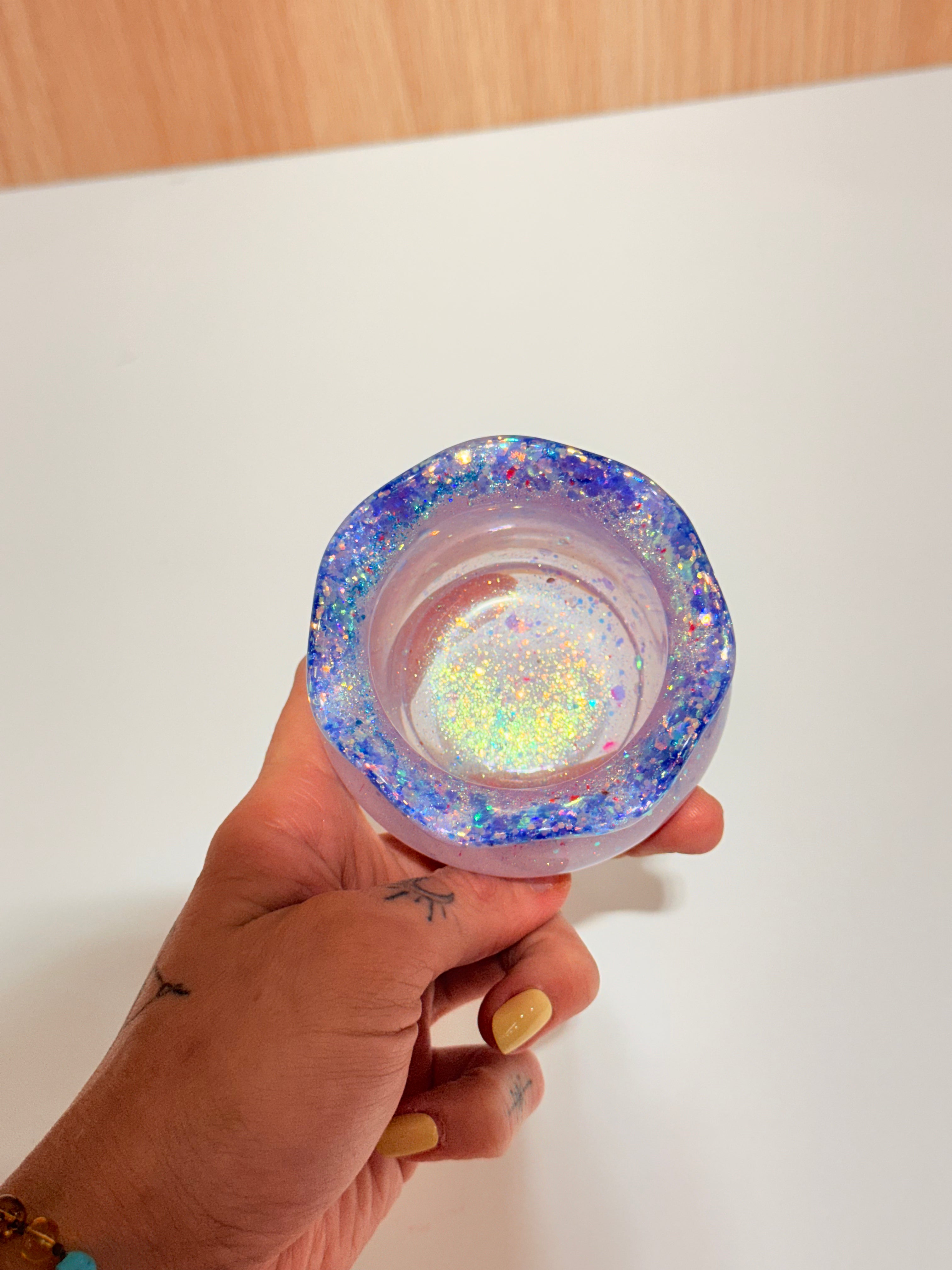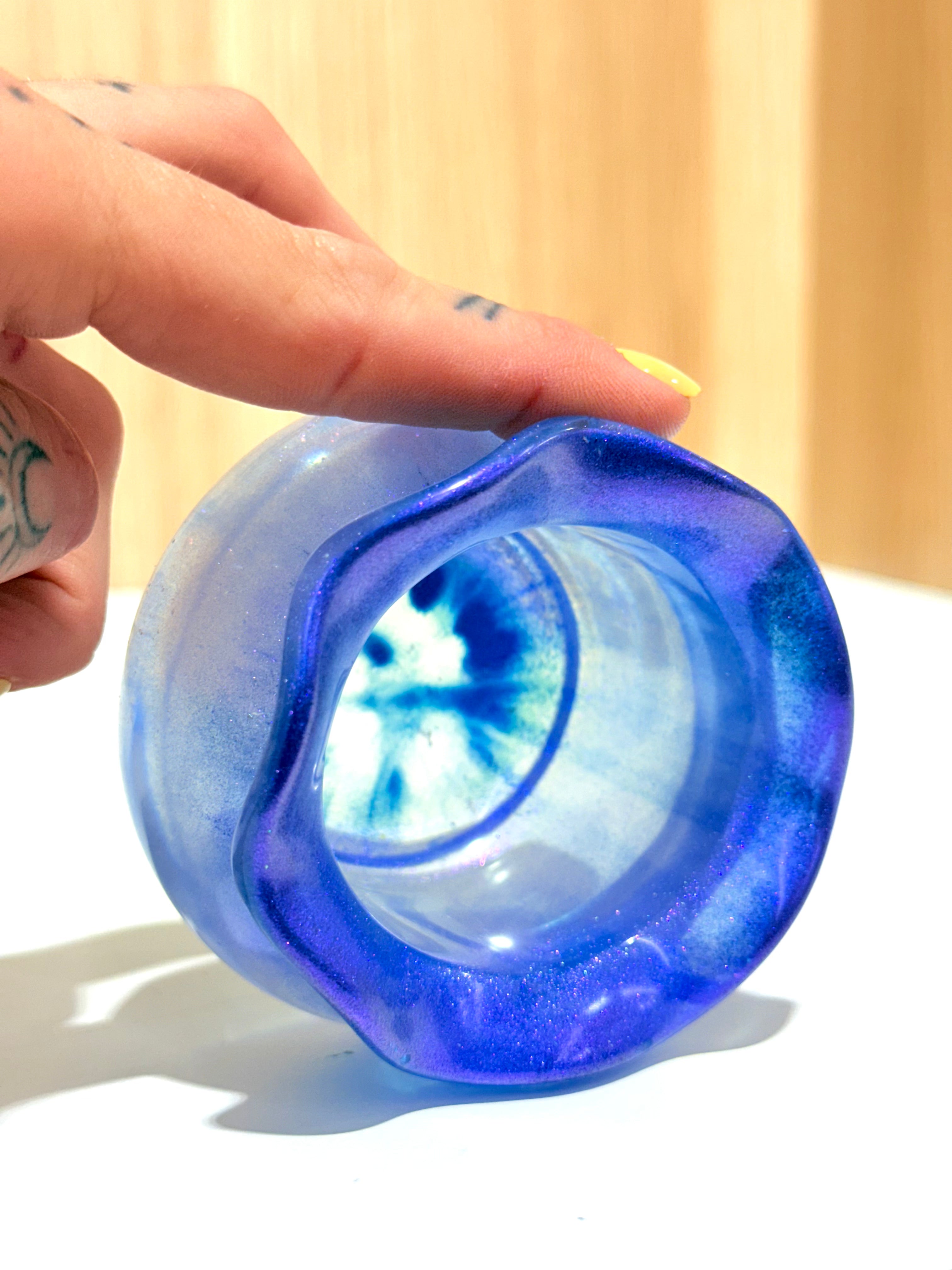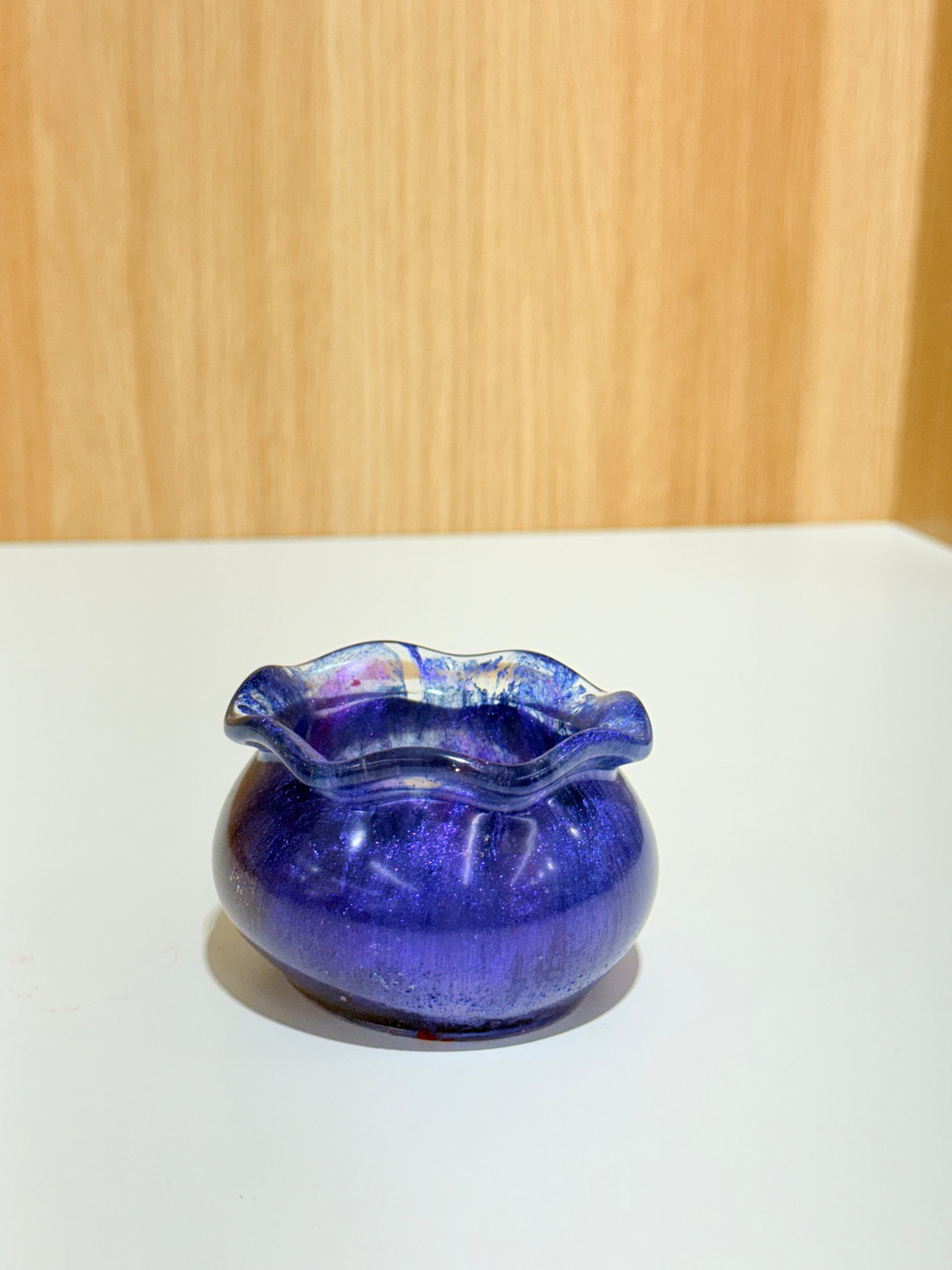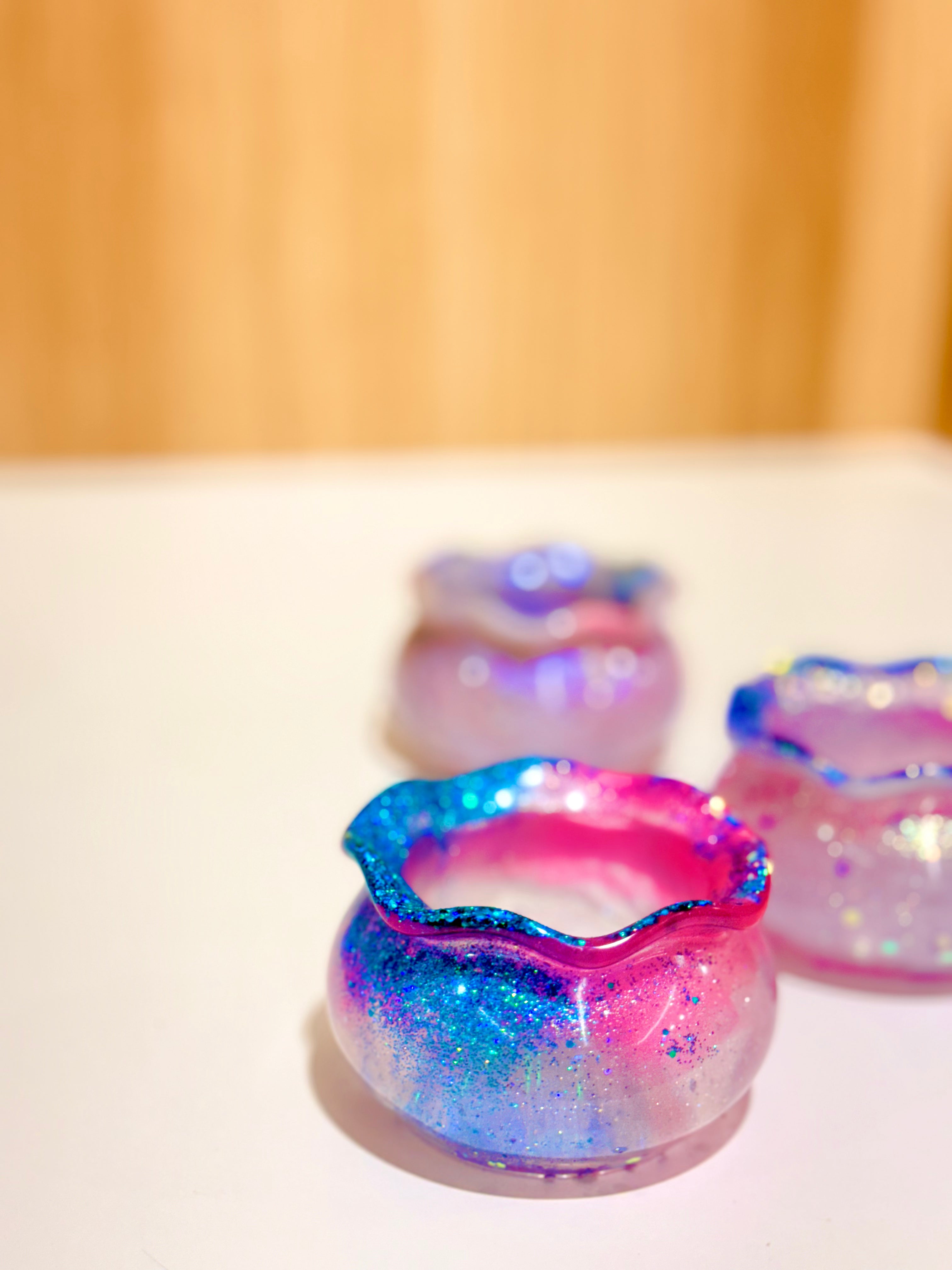 Hand-poured and one-of-a-kind, these resin pots feature soft, rounded “sack” shapes with gently ruffled rims and dreamy blends of purples, pinks, blues, and shimmering glitter. No two are ever the same—each one feels like a little treasure waiting to be discovered.