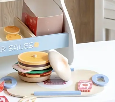 • Wooden burger toy with a mix of wooden and felt ingredients