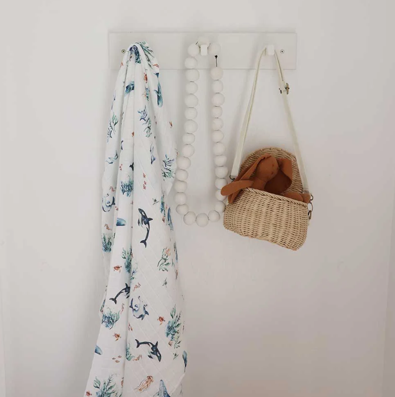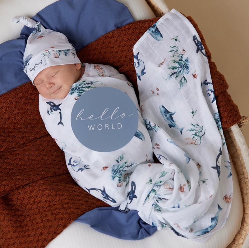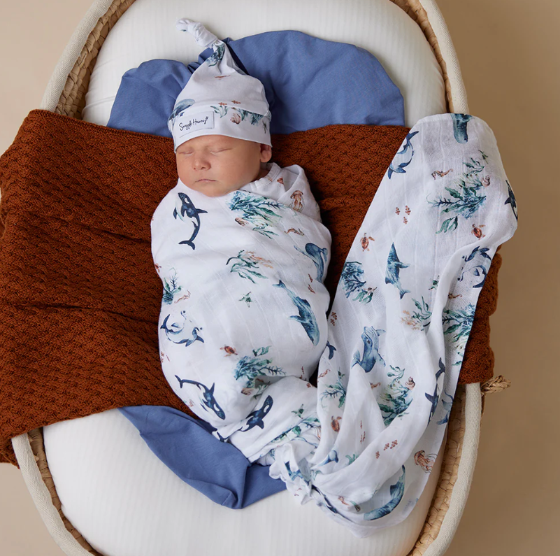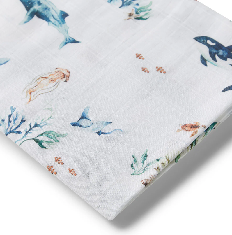 Snuggle Hunny soft organic cotton muslin wrap features our Ocean design and is a beautiful multi-purpose wrap ideal for swaddling and wrapping bub.