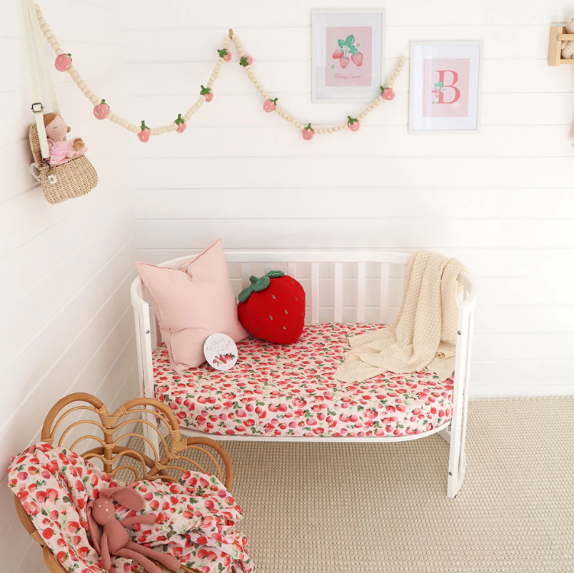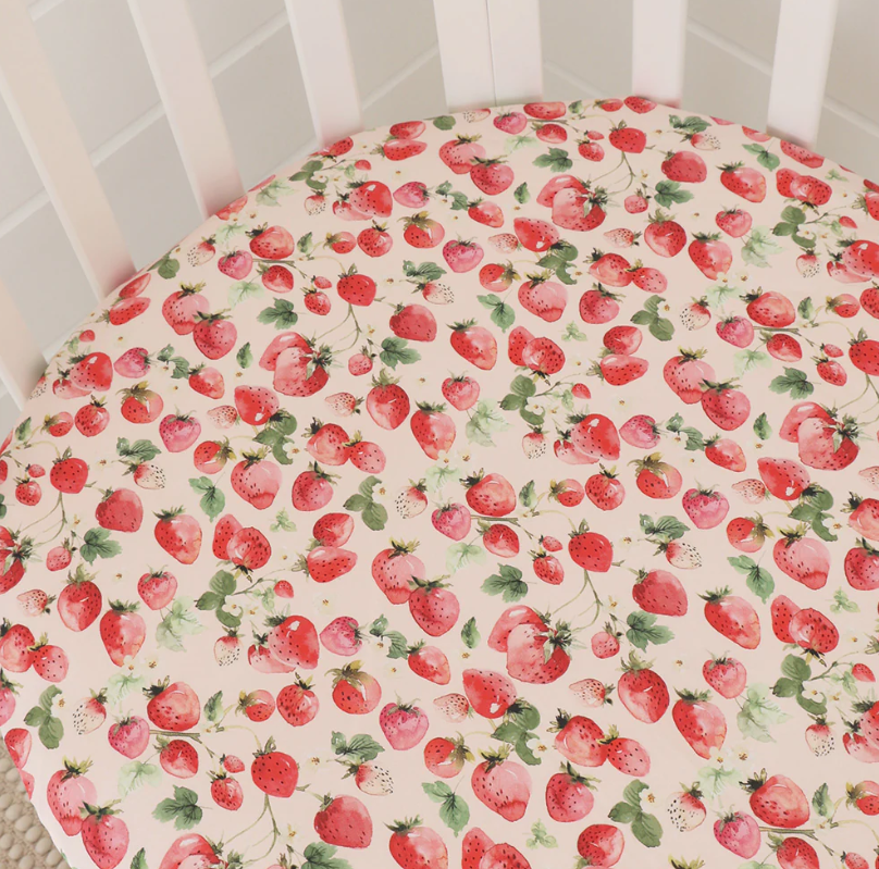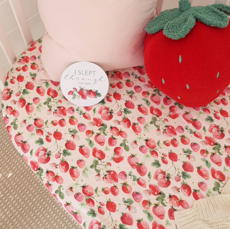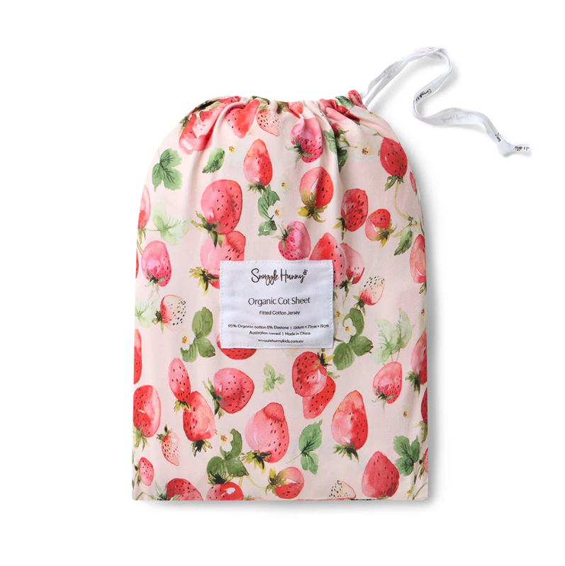 Our Snuggle Hunny Strawberry Fitted Cot Sheet is made from snuggly soft organic stretch cotton jersey. It is stretchy so fits most cot mattress sizes and comes in a matching drawstring bag.