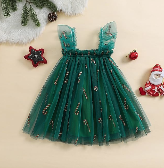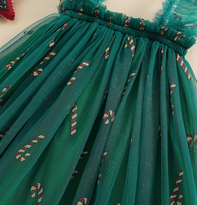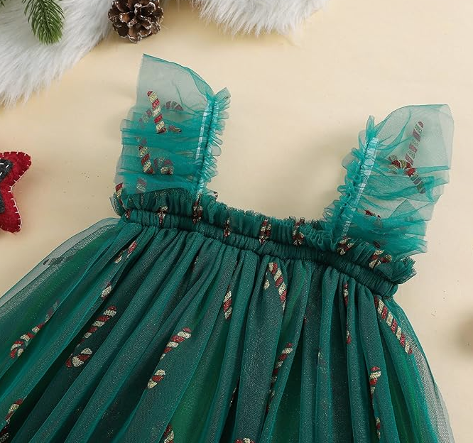 Celebrate the magic of Christmas in style with our Christmas Candy Cane Dress! This festive showstopper features a deep emerald green base, topped with a full frill layer covered in shimmering gold and red glitter candy canes. With two adorable frilled shoulder straps, it’s a twirl-worthy design that’s as sweet as the season itself — perfect for festive gatherings, Christmas photos, or holiday adventures.