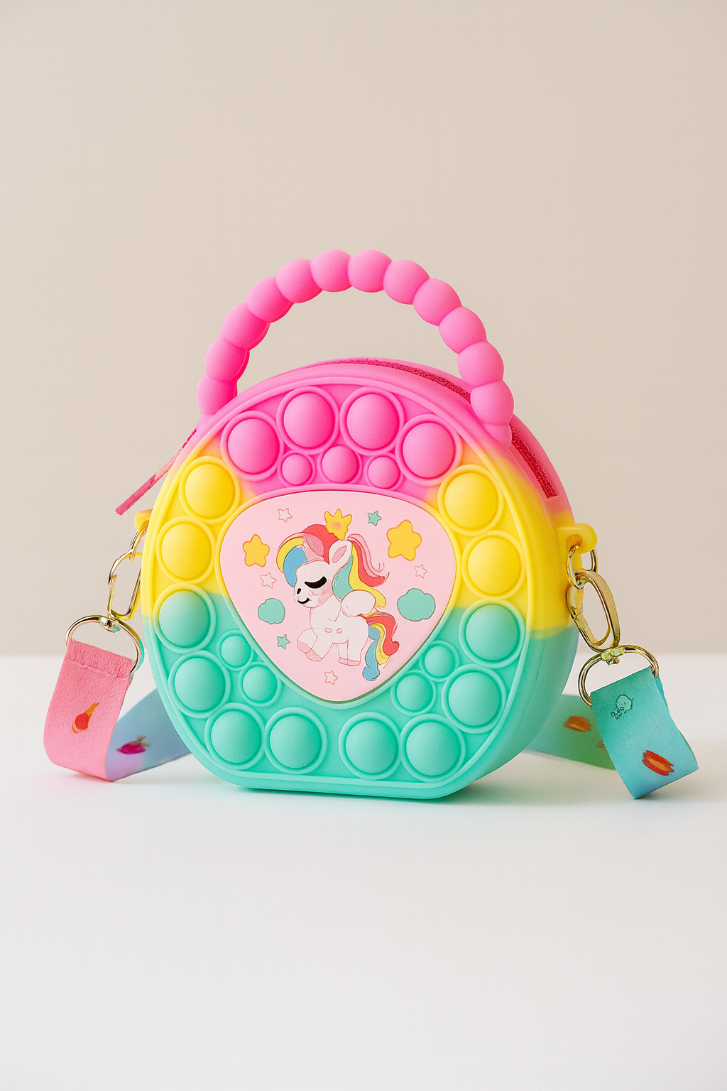 A darling crossbody bag crafted from soft, pastel-colored silicone. This enchanting purse is the perfect companion for any little adventurer, featuring a delightful pop it on the front and back for added fun and functionality.