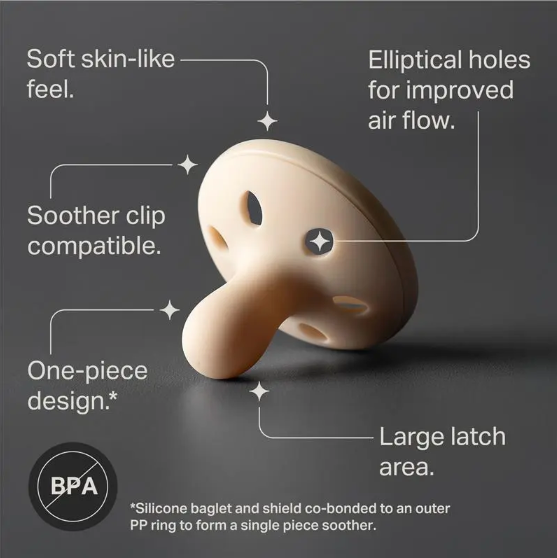 Soft to touch and barely-there, this soother looks and feels like a breast. With a familiar shape and skin-like feel, it's made to support your feeding journey, and specially designed to help reduce nipple confusion with continuous comfort and a natural latch.