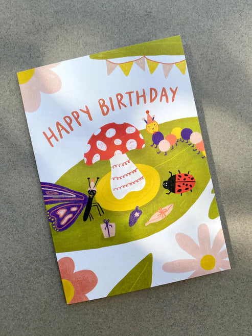 Illustrated "Happy Birthday" bug party themed greeting card. Surrounding a toadstool cake, a cute caterpillar, ladybird and butterfly are pictured having a birthday party with bunting above. This card is perfect for a little one's birthday. Blank inside for a personal message