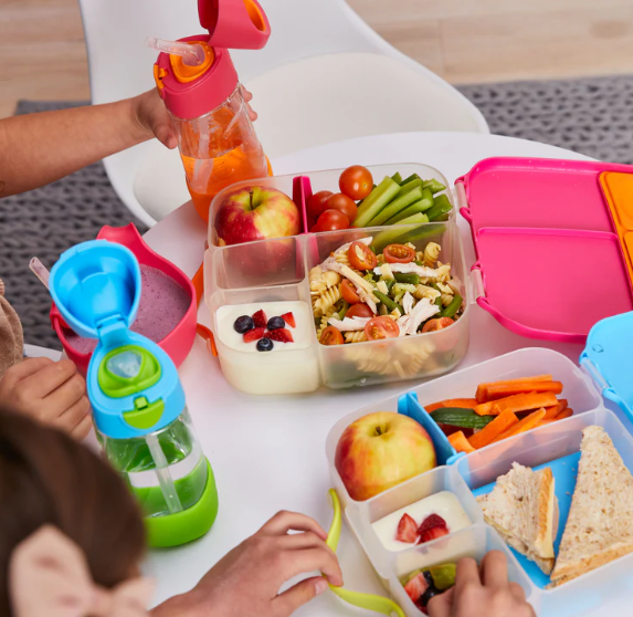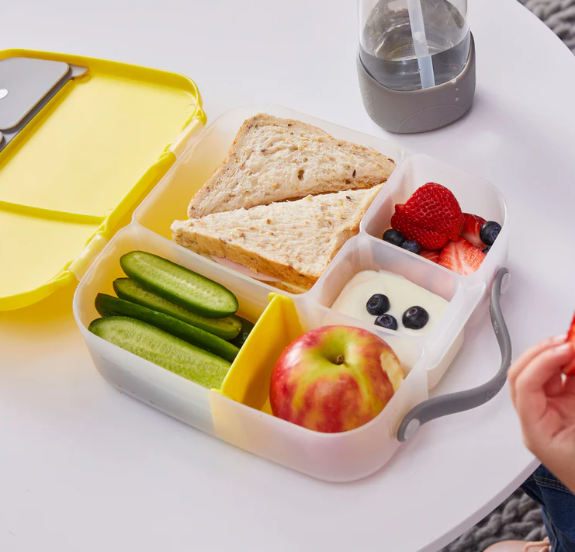 The whole foods lunchbox. Kids love different choices throughout the day, so we’ve designed a lunchbox that offers parents and kids more flexibility. The lunchbox features a large compartment that fits a whole sandwich. Plus, sitting underneath the tray is an included gel cooler pack to keep food fresher and cooler for longer. Or, remove the sandwich tray and the compartment now easily fits pasta and salads. Its unique flexi whole fruit holder lets you store a whole apple, as the stretchy seal bends around the shape of your fruit – no need to cut fruit into smaller sizes! Leak-proof silicone seals lets you store wet foods like watermelon and yoghurts (no liquids). The custom divider slides across enabling parents to adjust the compartment size as they need, or remove it to fit a whole banana or wrap.