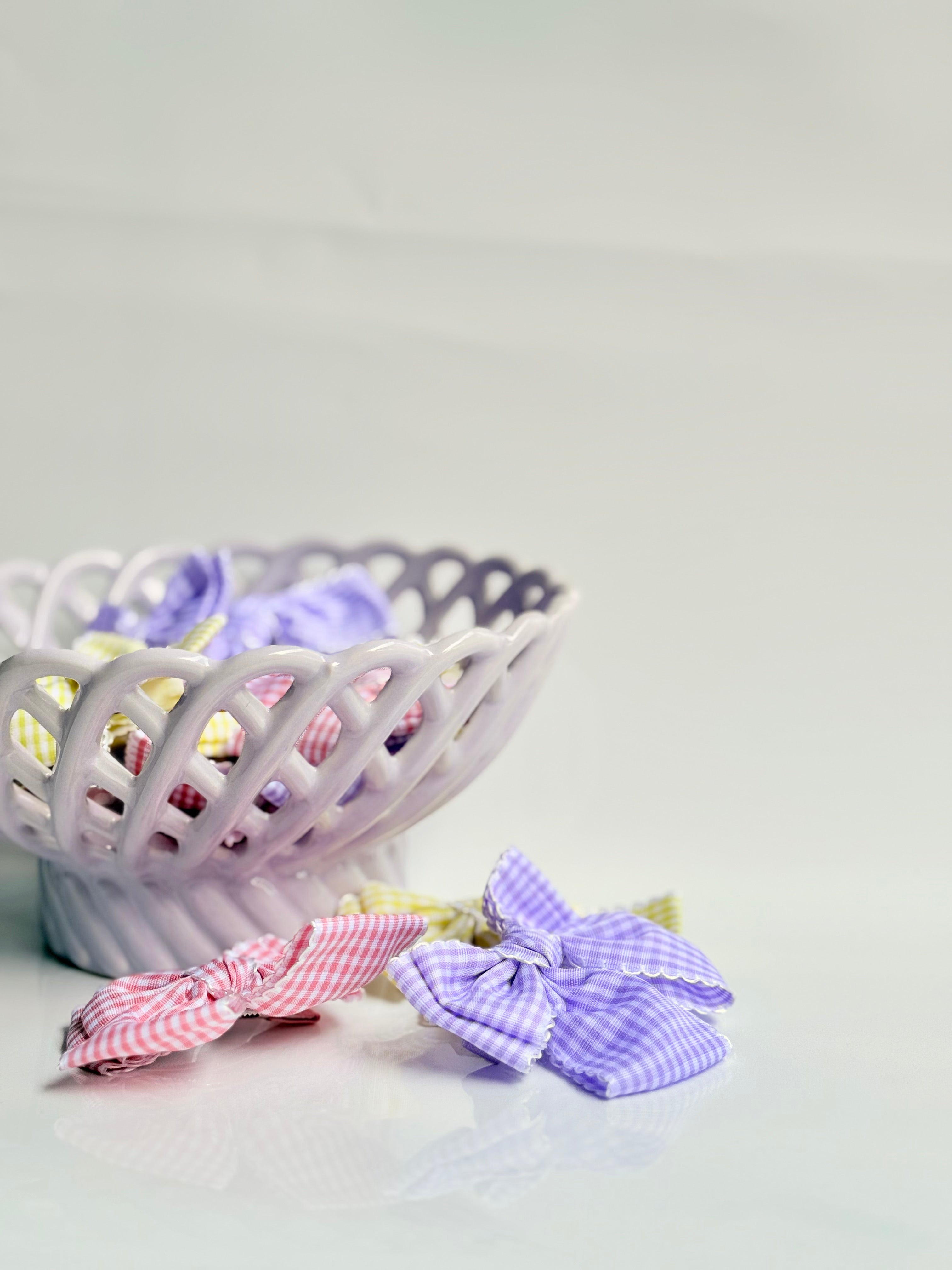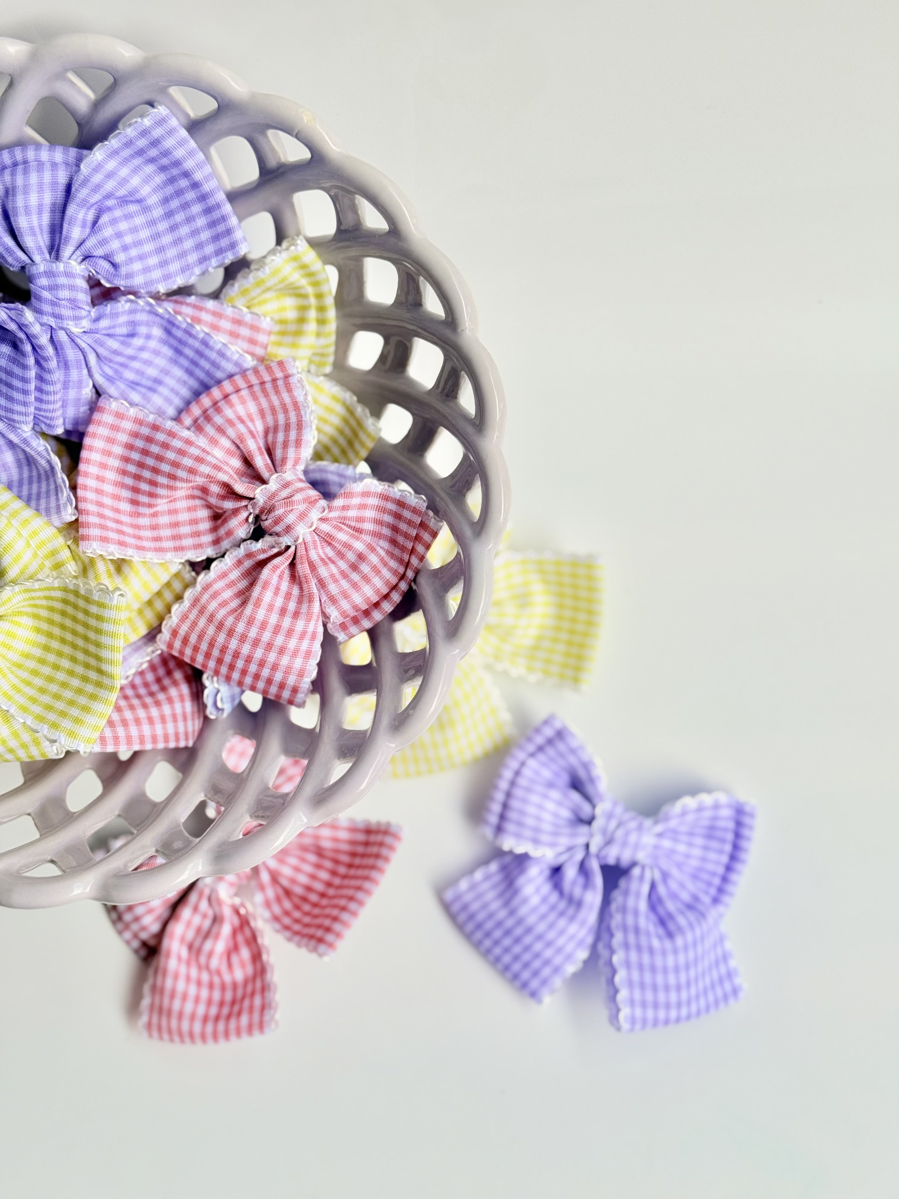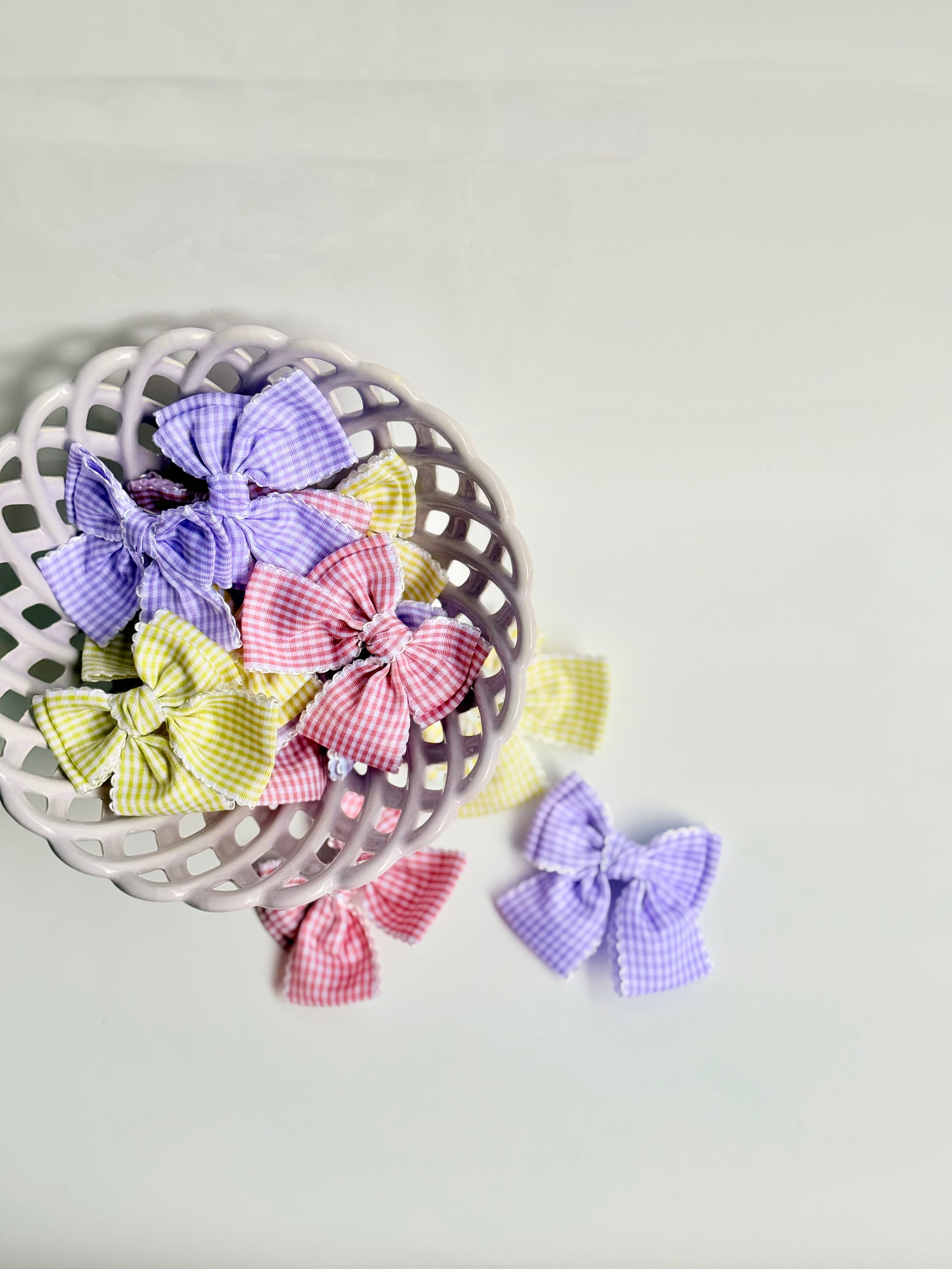 These adorable gingham bow clips are the perfect finishing touch for playful, everyday hairstyles. Made with soft gingham fabric in gentle shades of pink, lavender, and yellow, each bow features delicate stitched edges for a charming, classic look.
