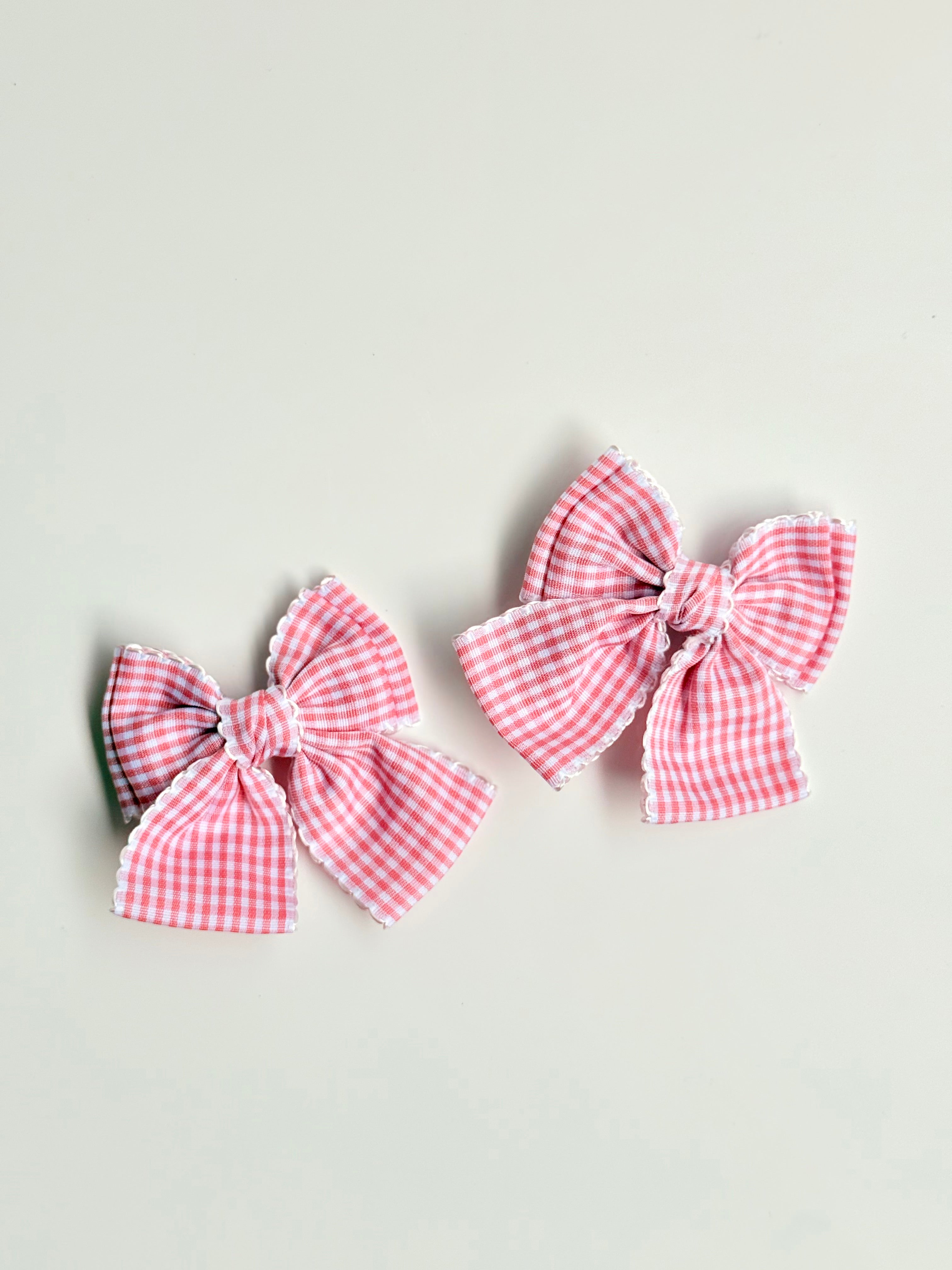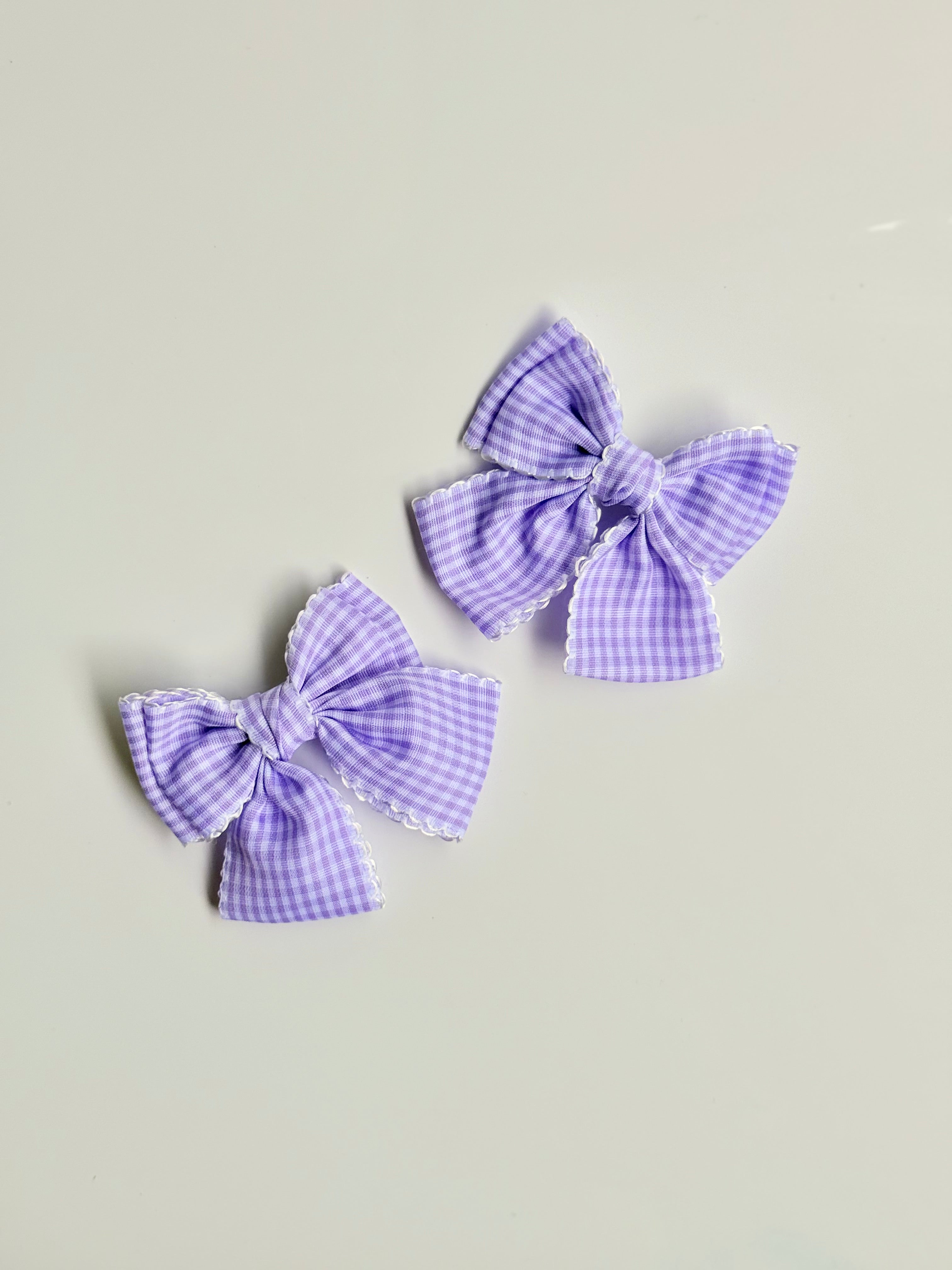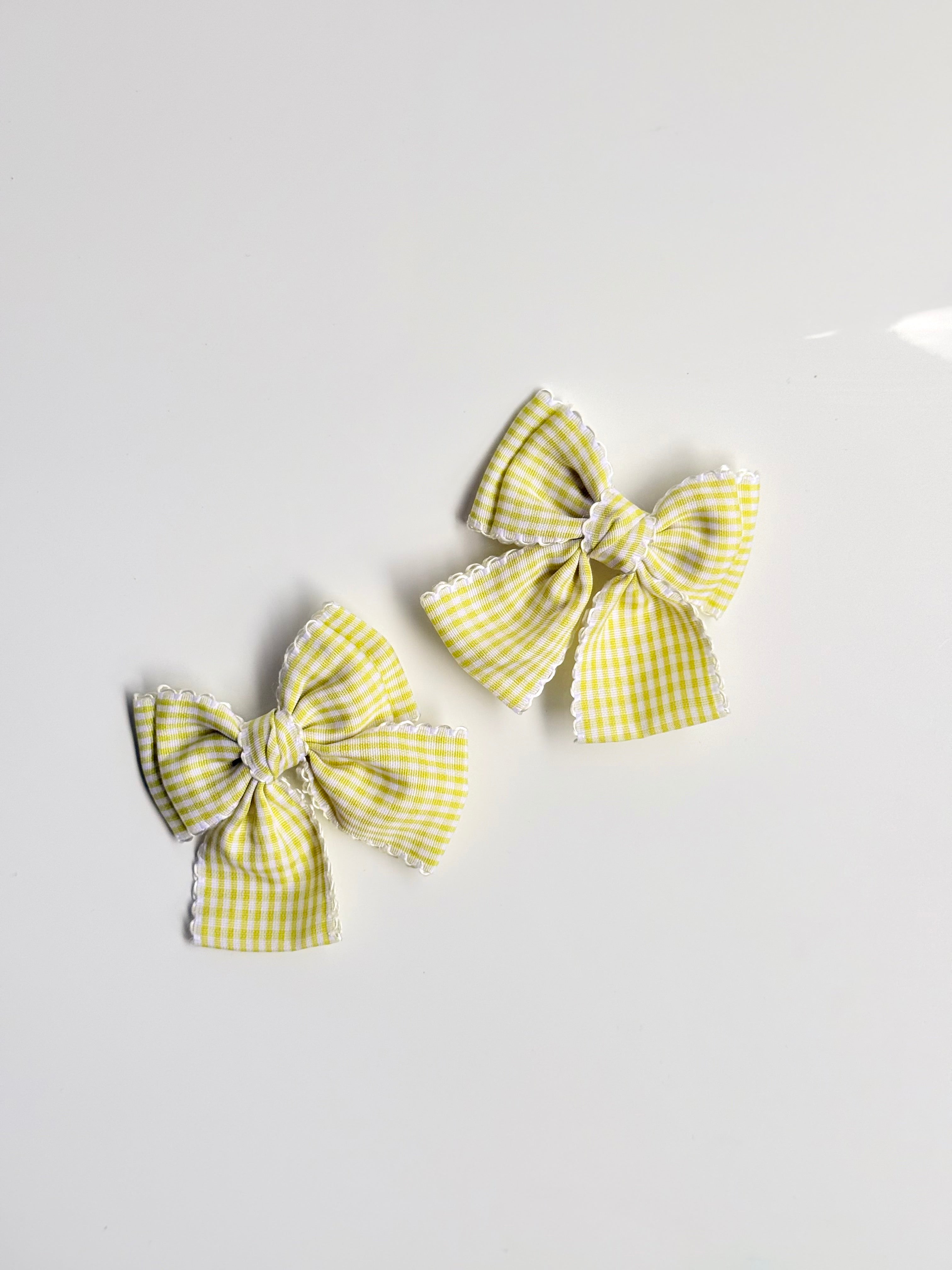 These adorable gingham bow clips are the perfect finishing touch for playful, everyday hairstyles. Made with soft gingham fabric in gentle shades of pink, lavender, and yellow, each bow features delicate stitched edges for a charming, classic look.