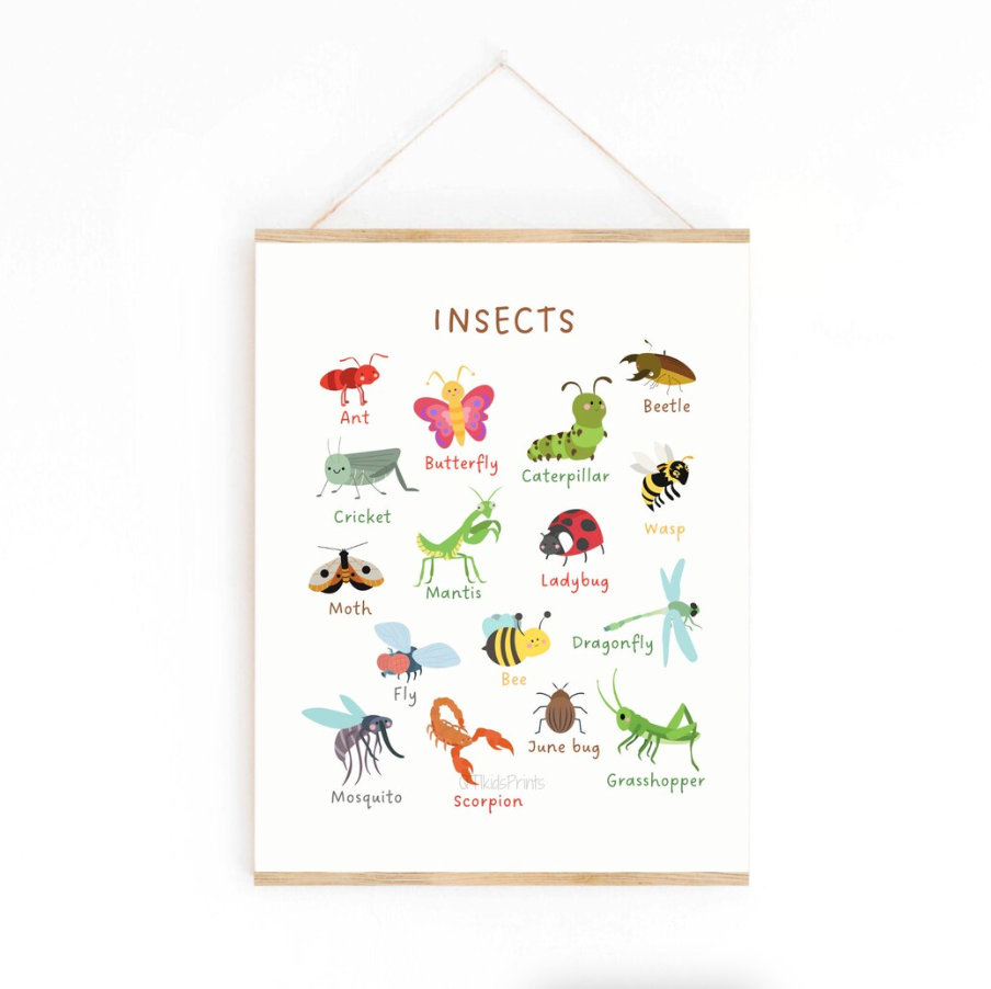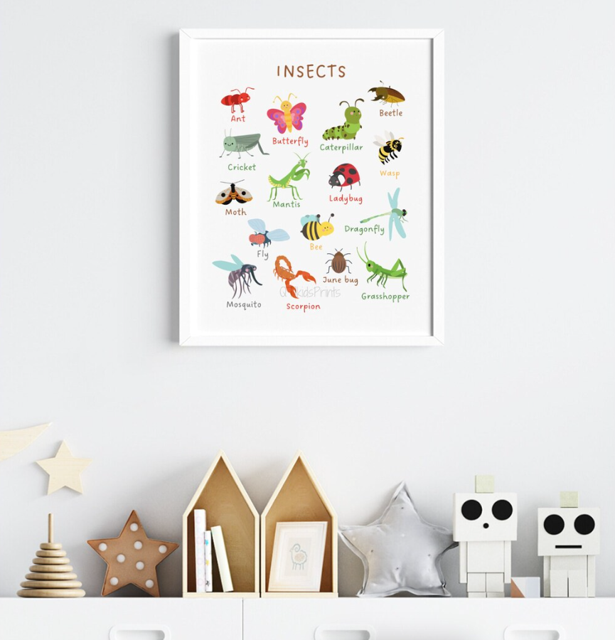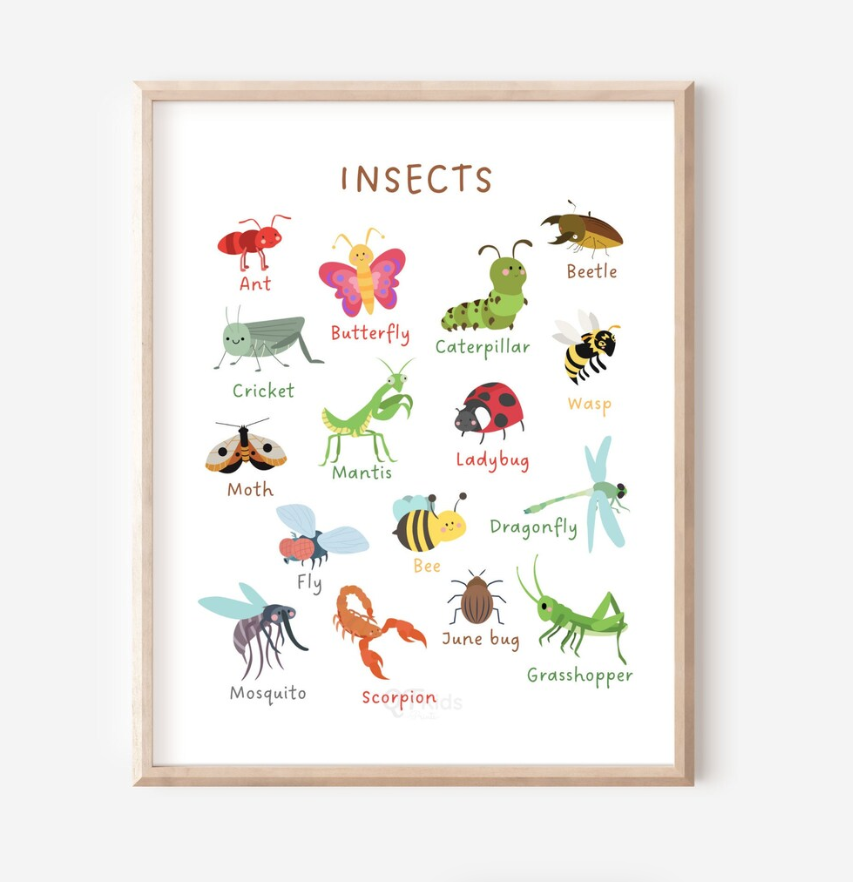 A charming and educational insect chart art print, perfect for children’s rooms, nurseries, playrooms, or classrooms. The illustration features colorful, friendly drawings of common insects such as ants, butterflies, ladybugs, bees, dragonflies, grasshoppers, and more, each clearly labeled to encourage learning and curiosity about nature.