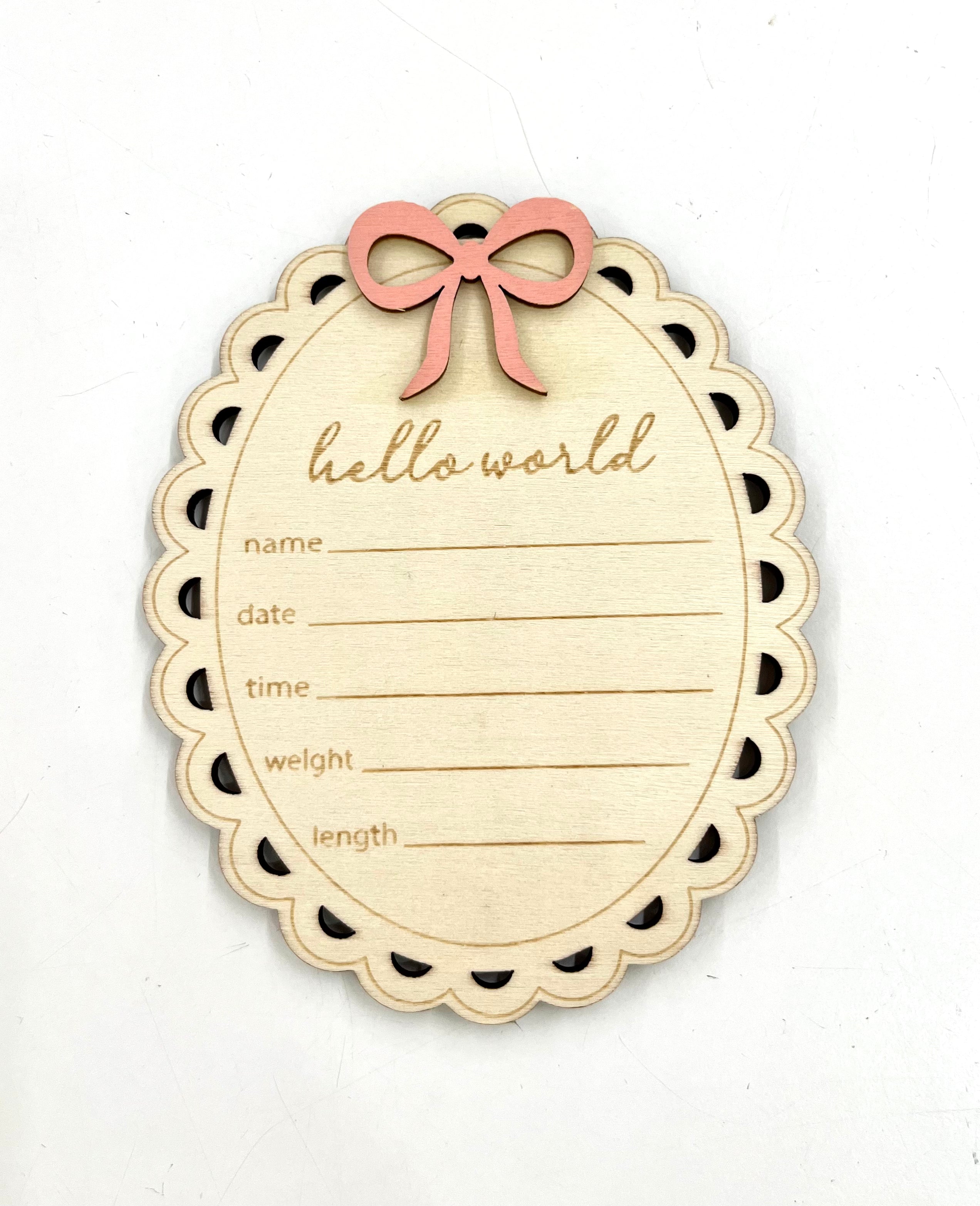 This beautifully crafted wooden plaque with a delicate scallop edge and sweet pink bow is the perfect way to capture and share your baby’s first details — name, birth date, weight, length, and time of arrival.