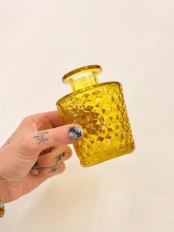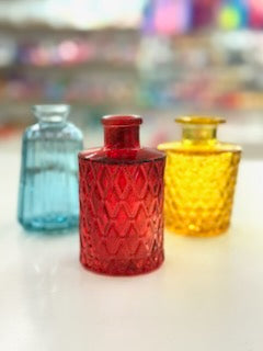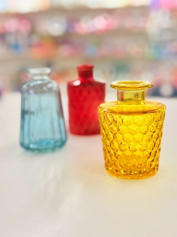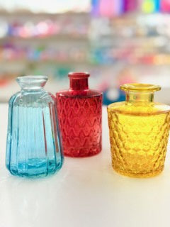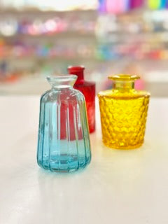 Add a touch of vintage charm with these sweet little glass vases — perfect for displaying small blooms, holding tiny treasures, or adding colour to a shelf or play space. Available in three stunning styles — Blue Ribbed, Red Diamond, and Yellow Hexagon — each piece is made from real glass and designed to catch the light beautifully. While ideal for décor, they can also be used for imaginative potion play with older children (with care!).