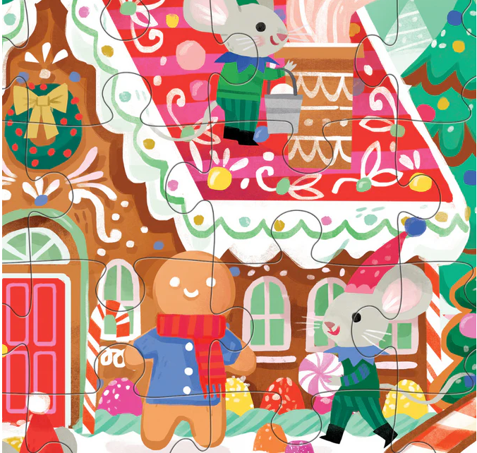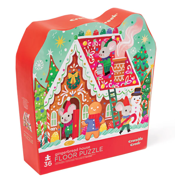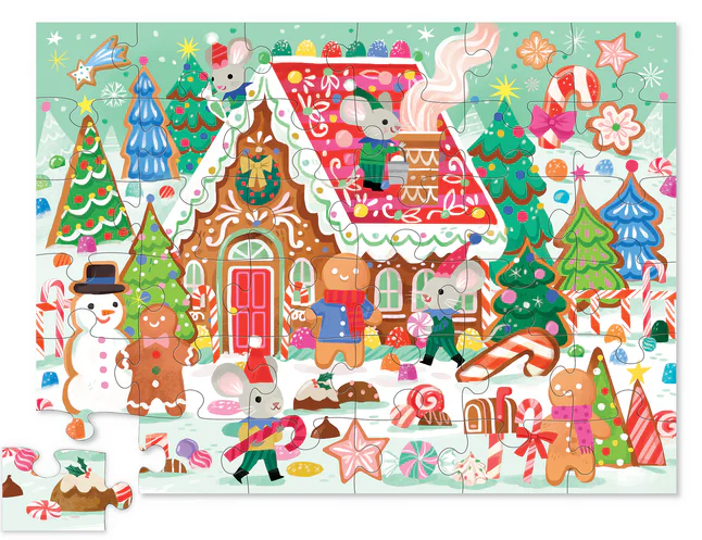 Puzzles made festive! This beautifully illustrated, very sweet Gingerbread House themed 36-piece floor puzzle dazzles in its unique contour-shaped storage box. The jumbo-sized, sturdy pieces of this high-quality puzzle are ideal for little hands.