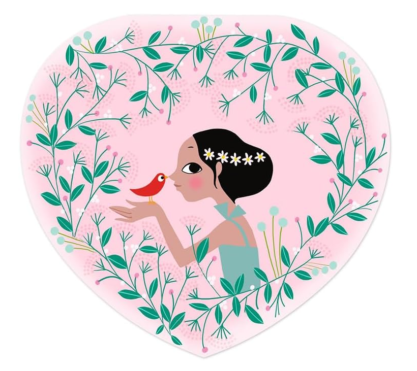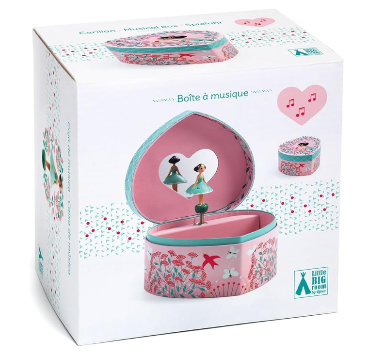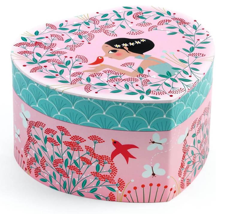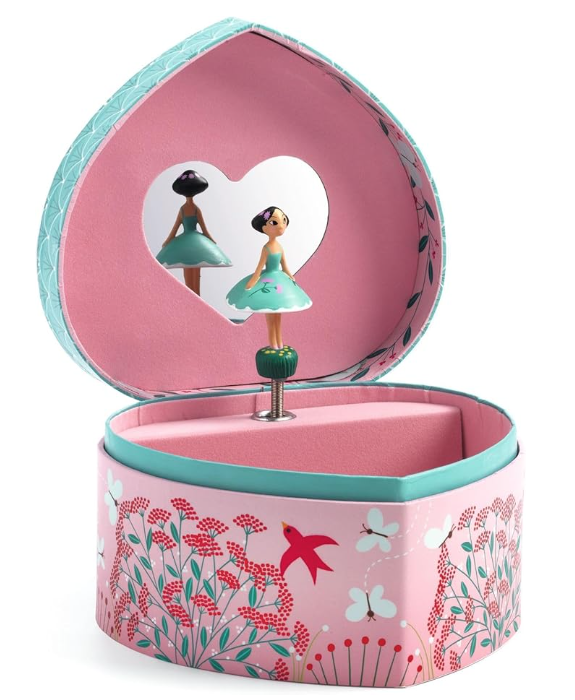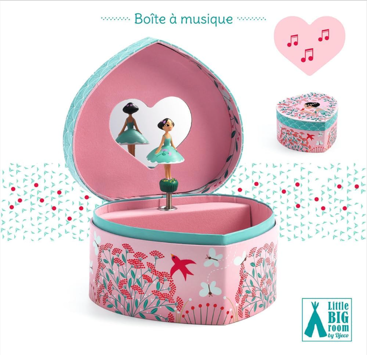 Mélodie du printemps (Spring Melody) is a pretty, heart-shaped music box for keeping jewellery and secret things in. Turn the handle and open the box for a surprise! A delicately carved dancer turns, reflected in a shaped mirror, to Carl Maria Von Weber's "Invitation to the Dance."