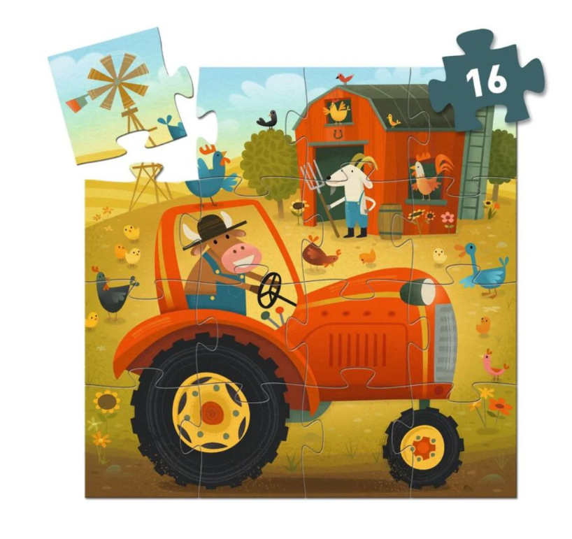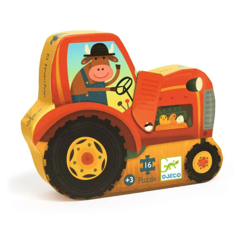 The tractor is back on the farm after a long day working in the fields. This colourful 16-piece puzzle comes in a lovely tractor-shaped box.