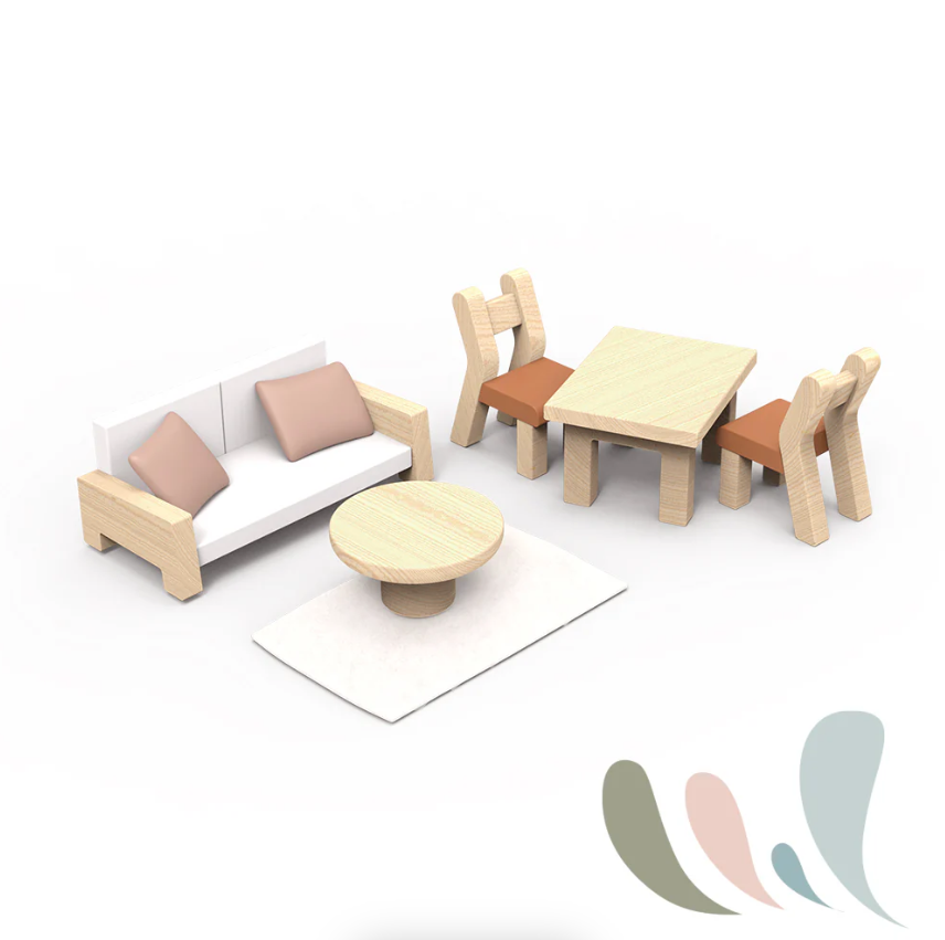 - Includes wooden doll house plus 6 piece furniture starter set (1 table, 2 Chairs, 1 Couch with 2 cushions, 1 Coffee Table, 1 Rug)