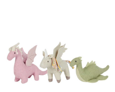 These three Magical Creatures are handmade with love from a soft wool blend and have sweet, embroidered features. Each Holdie Magical Creature will look a little bit different, making them extra special. Unicorn, Dragon and Nessy can stand on their own and are the perfect size to fit in a small hand or close by in a pocket for easy cuddles. Come and say hello!