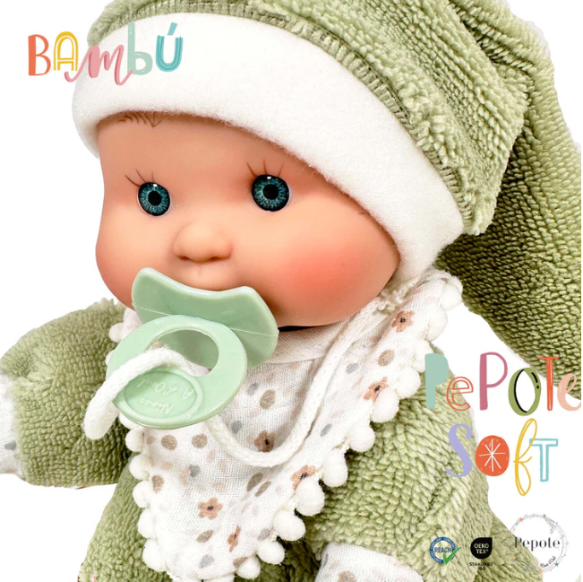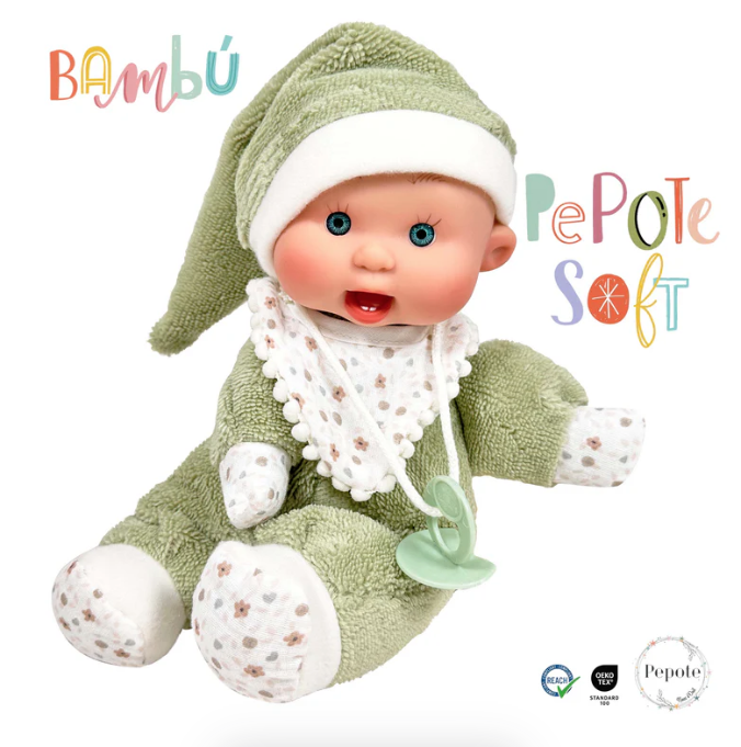 Our Pepotes Soft Bambú dolls are the cuddliest in our collection, dressed in cozy, pastel outfits handmade from eco-friendly fabric.
