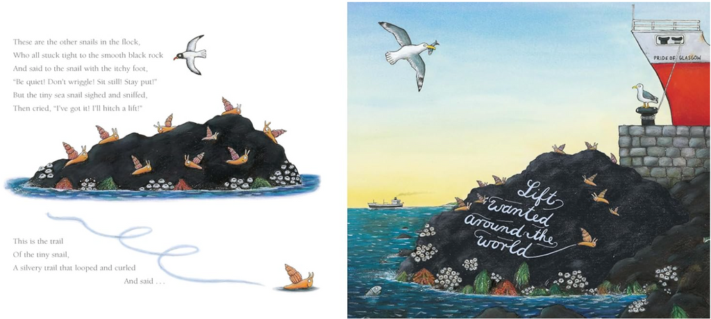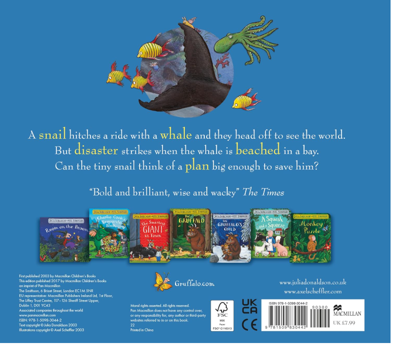 One little snail longs to see the world and hitches a lift on the tail of an enormous whale. Together they go on an amazing journey, past icebergs and volcanoes, sharks and penguins, and the little snail feels so small in the vastness of the world. But when disaster strikes and the whale is beached in a bay, it's the tiny snail's big plan that saves the day.