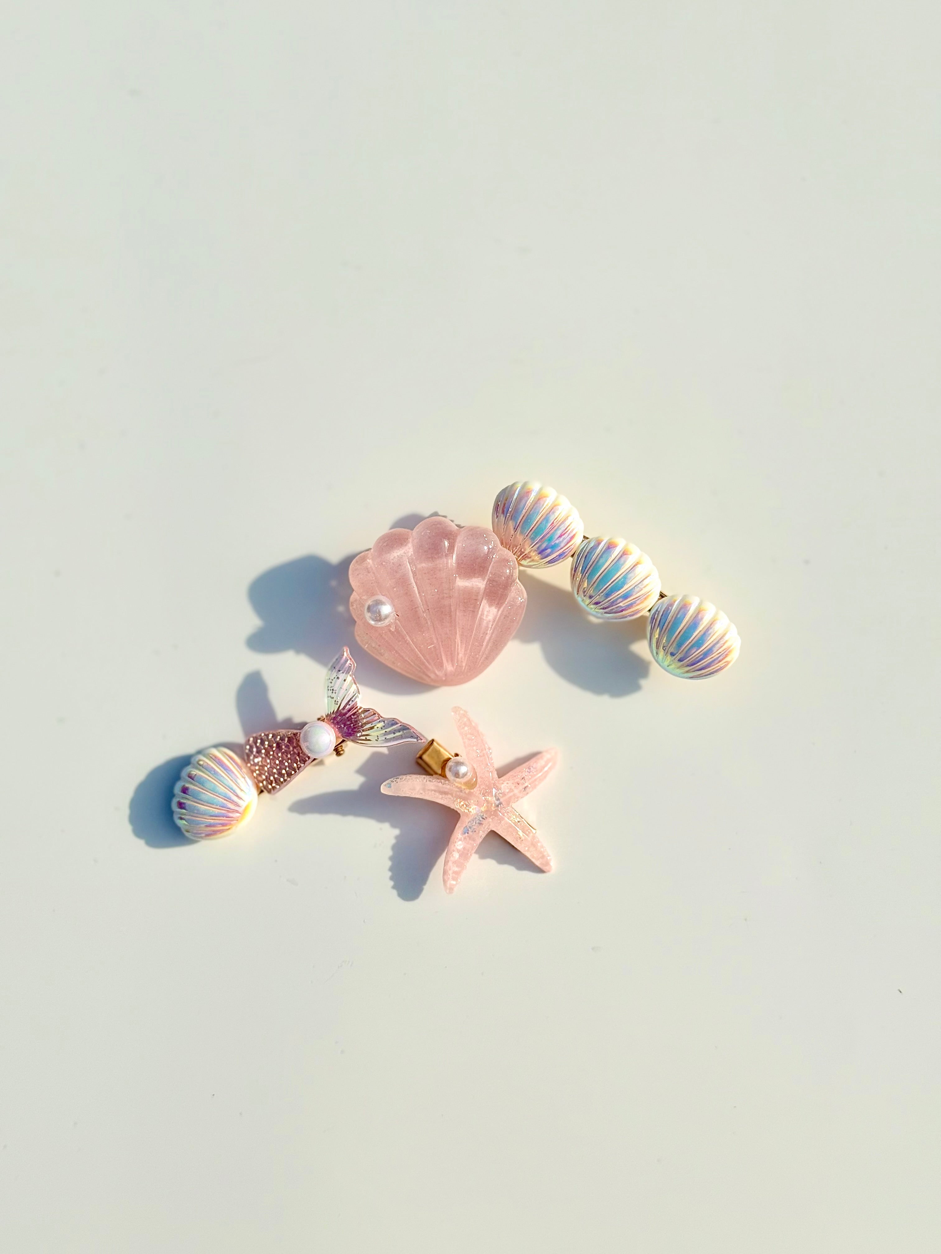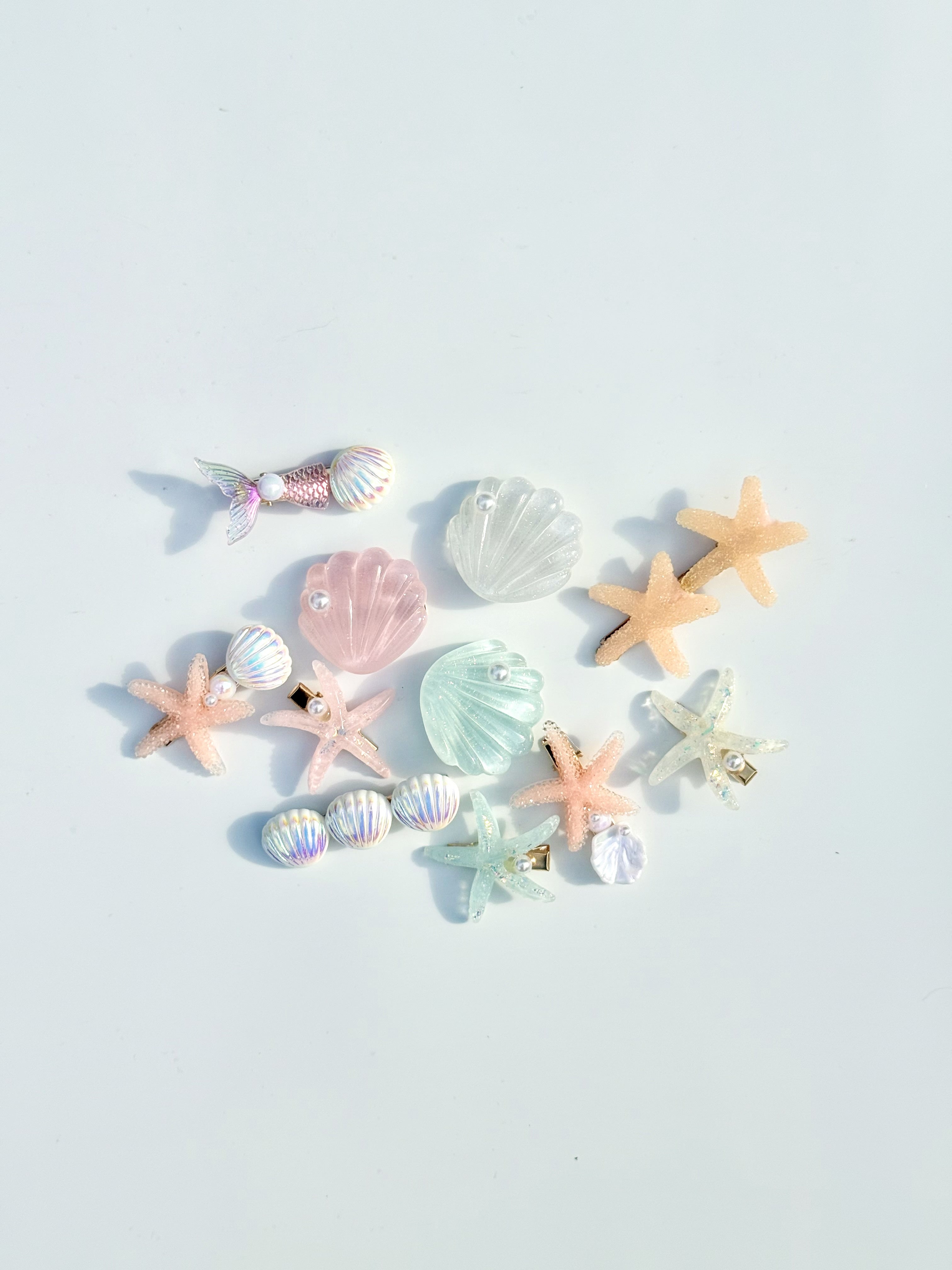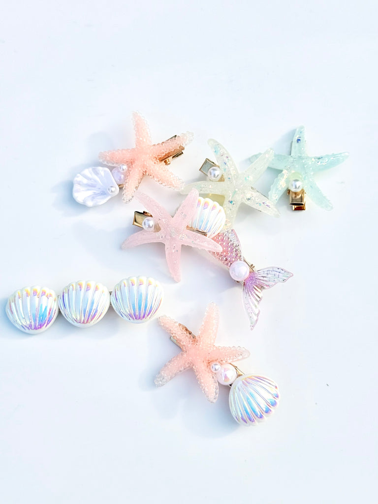 Bring a touch of ocean magic to any hairstyle with our Under the Sea Hair Clips — shimmering pastel designs inspired by starfish, seashells, and mermaid tails.