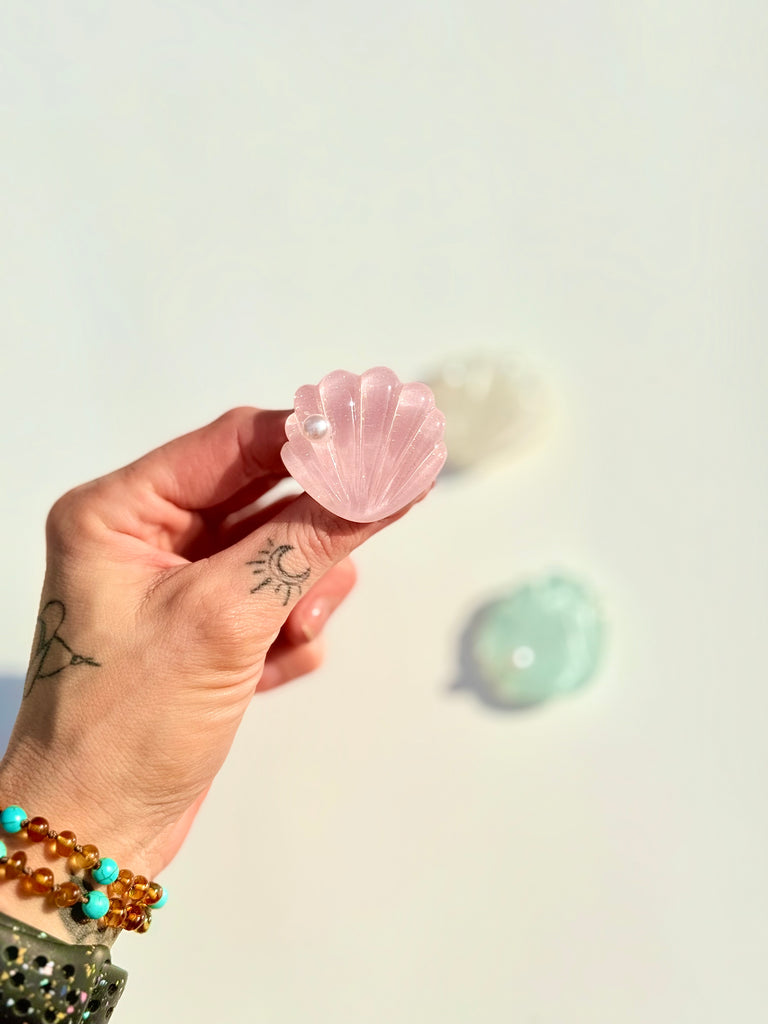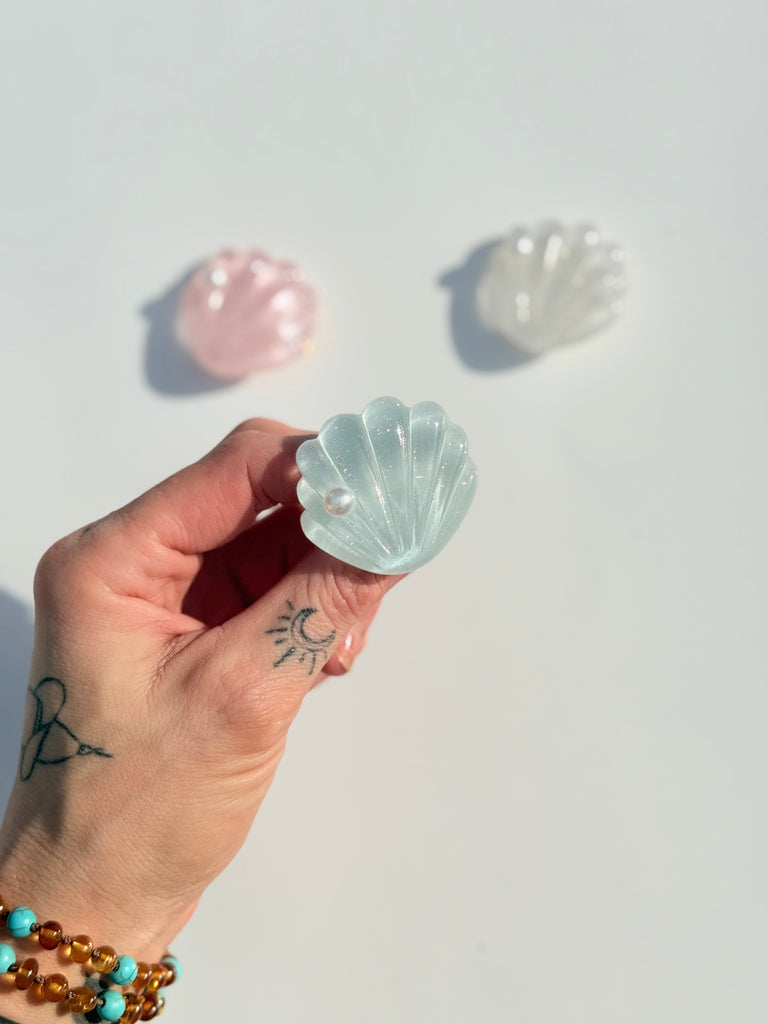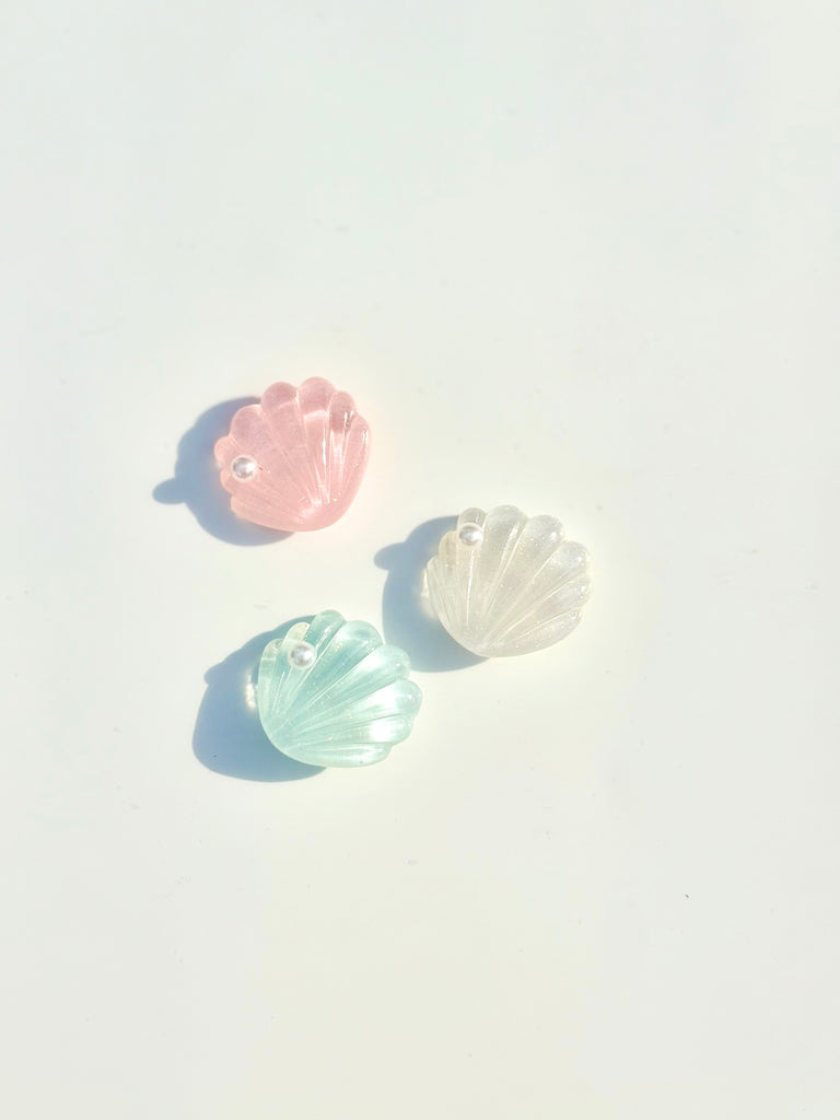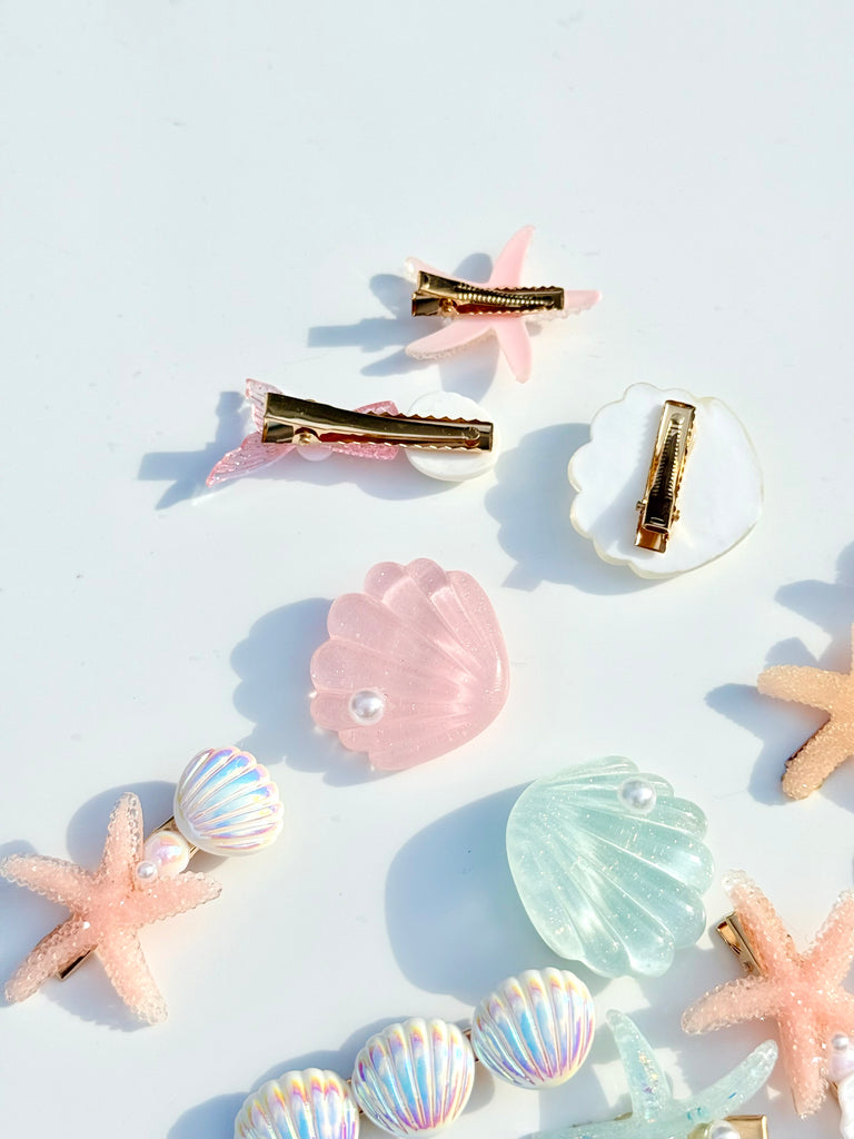 Each clip sparkles with delicate pearls, iridescent shimmer, and glitter resin for a dreamy, beachy finish.
