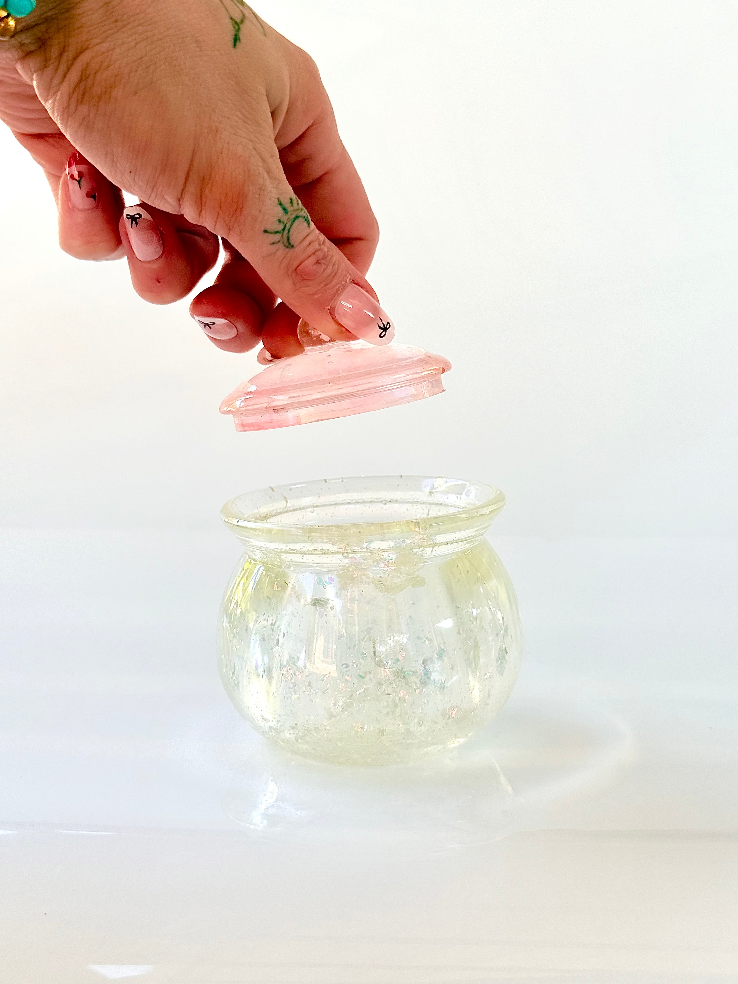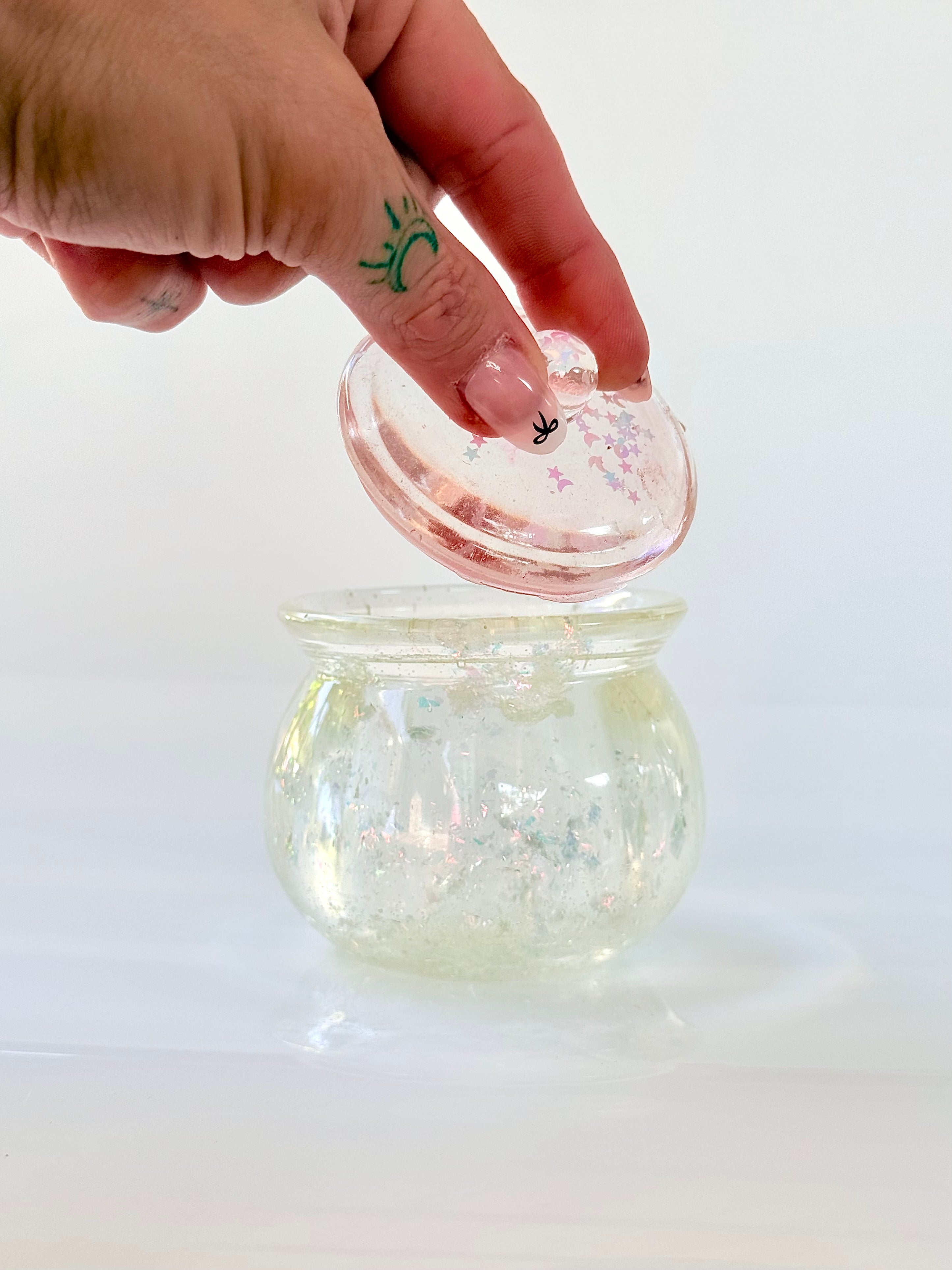 This pot features a rounded, crystal-inspired shape with a matching lid topped by a smooth orb handle, making it perfect for potion play, sensory treasures, fairy finds, crystals, or tiny keepsakes. The translucent finish gives it an airy, almost glass-like appearance, while subtle sparkles and micro-details add a dreamy, enchanted feel.