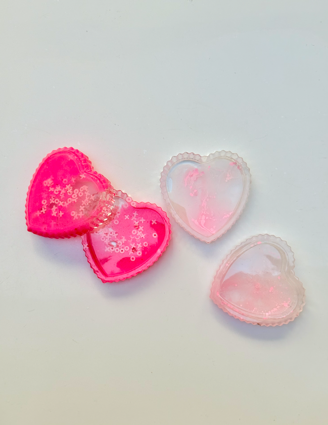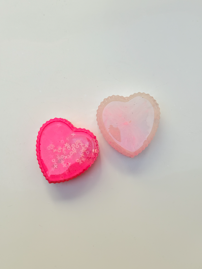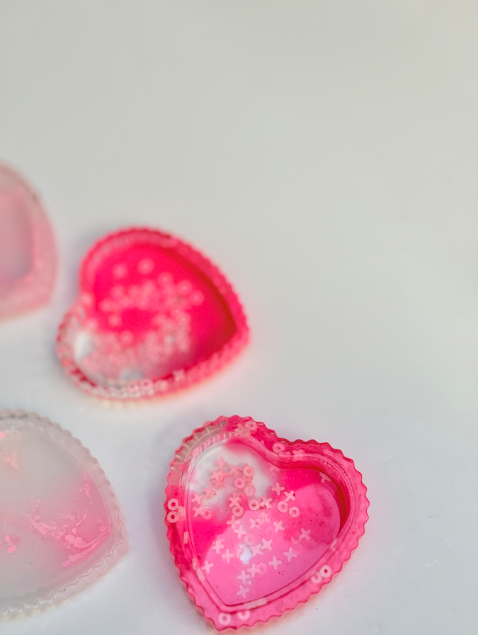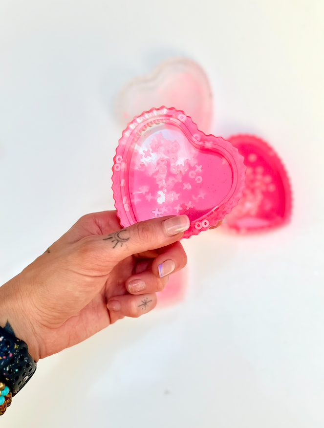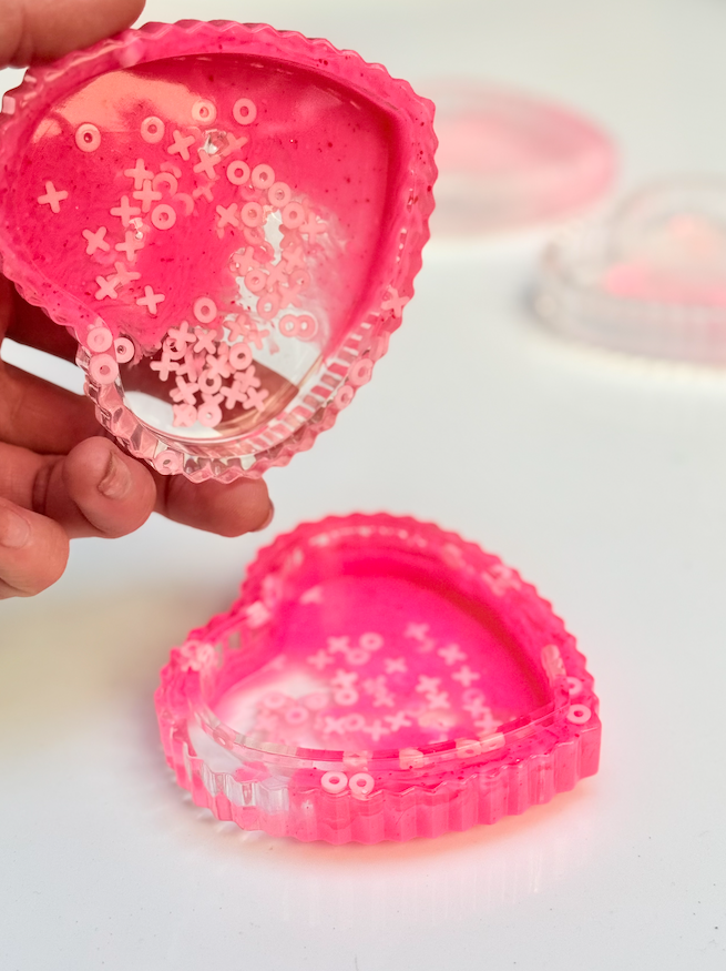 Bright, bold + super sweet — this heart-shaped resin trinket box is created in a vibrant pink and features tiny X’s and O’s sealed inside the resin for a love-letter inspired detail.