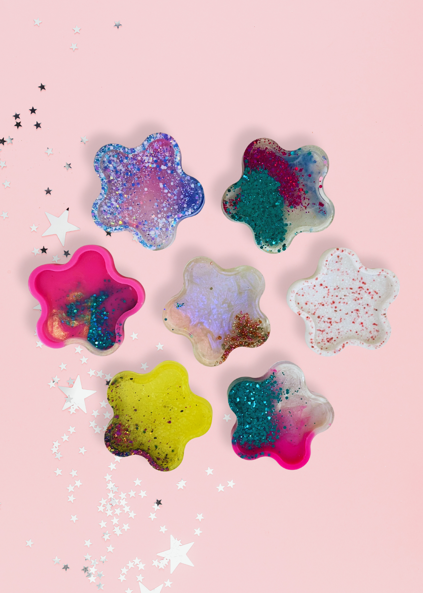 Bring sparkle, colour, and celestial magic to your play setup with our Resin Star Dish collection. Each star-shaped dish is hand-poured in unique resin blends — from bright glitter bursts to soft pastels, candy tones, translucent swirls, and speckled confetti finishes. No two are ever the same, making every dish its own little treasure.