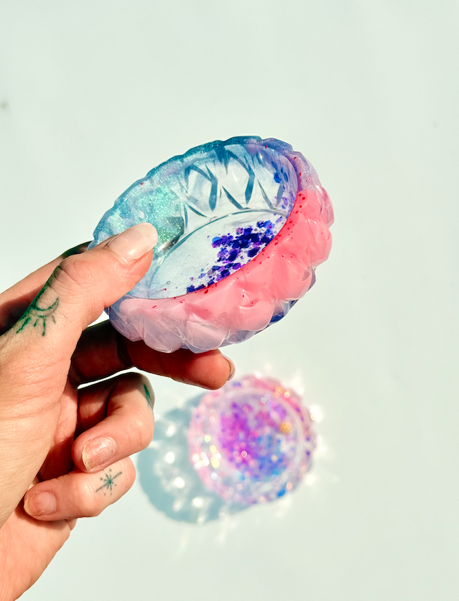 Resin creates tiny air pockets when poured — in this design, those bubbles are intentional! The rounded edges form as the resin naturally settles around the mould, giving each bowl a perfectly imperfect, organic “bubble” shape that’s irresistibly touchable.