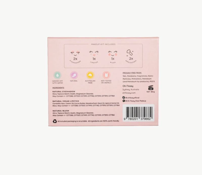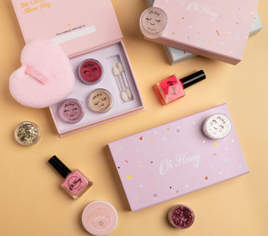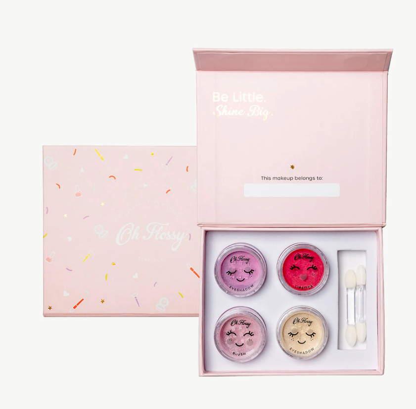 The Oh Flossy Mini Makeup Set is designed for little ones taking their first step into creative play. With soft, shimmery shades and gentle, natural formulas, it lets kids explore colour safely while parents can relax knowing every product is non-toxic, vegan, and washable with just water — no harsh scrubbing or chemicals needed.