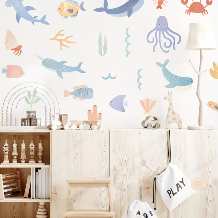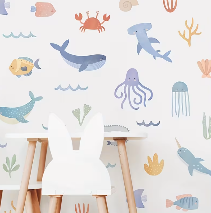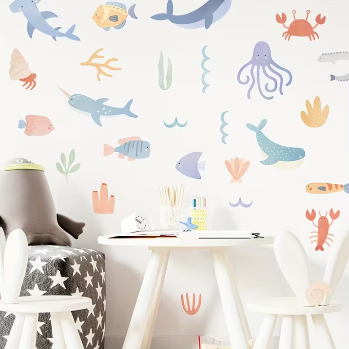 Bring an ocean of imagination to your child’s room with these charming Under the Sea Wall Decals. Featuring adorable illustrated sea creatures—whales, octopus, fish, coral, shells, and more—this pastel-toned set adds a soothing, playful underwater vibe to any nursery or playroom. The decals are easy to apply, removable, and endlessly fun to arrange, letting you create your own ocean adventure right on the wall.